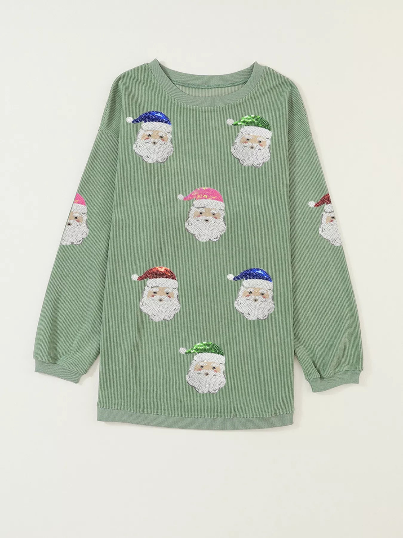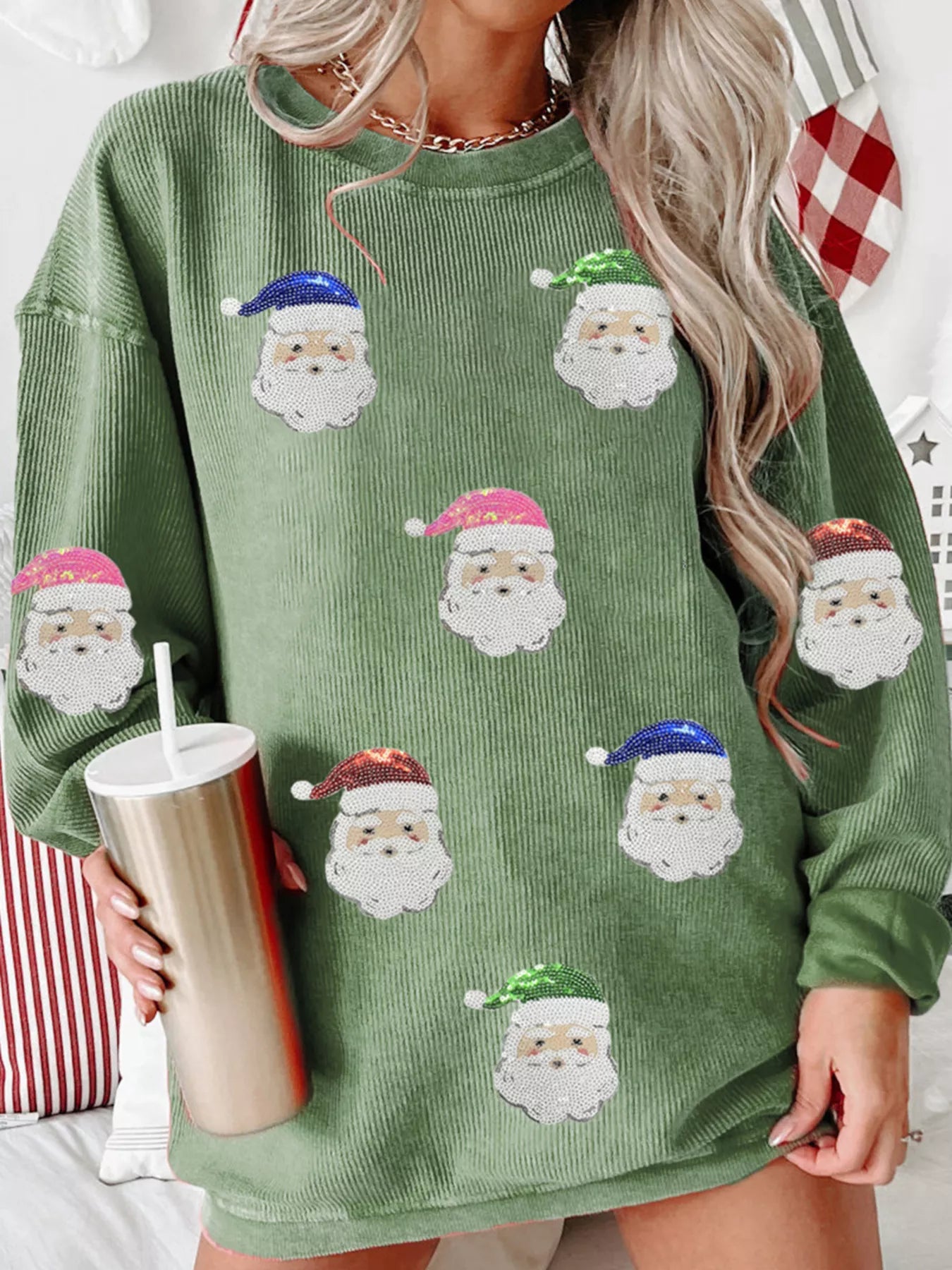Corded Ribbed Sequin Patched Santa Claus Graphic Sweatshirt