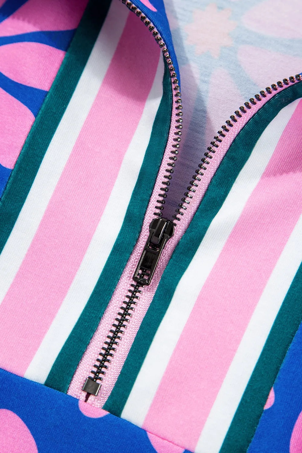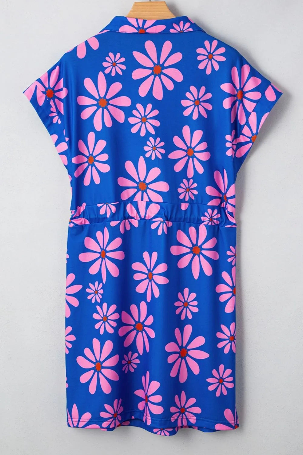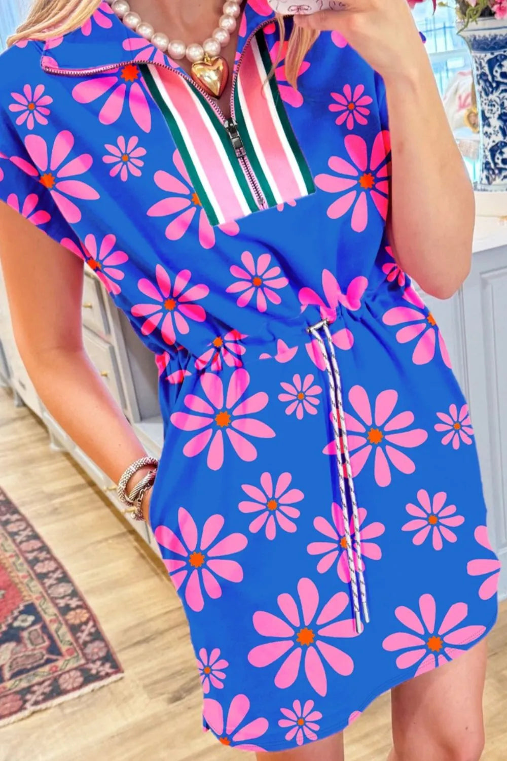 Floral Print Zip Collar Drawstring Summer Mini Dress