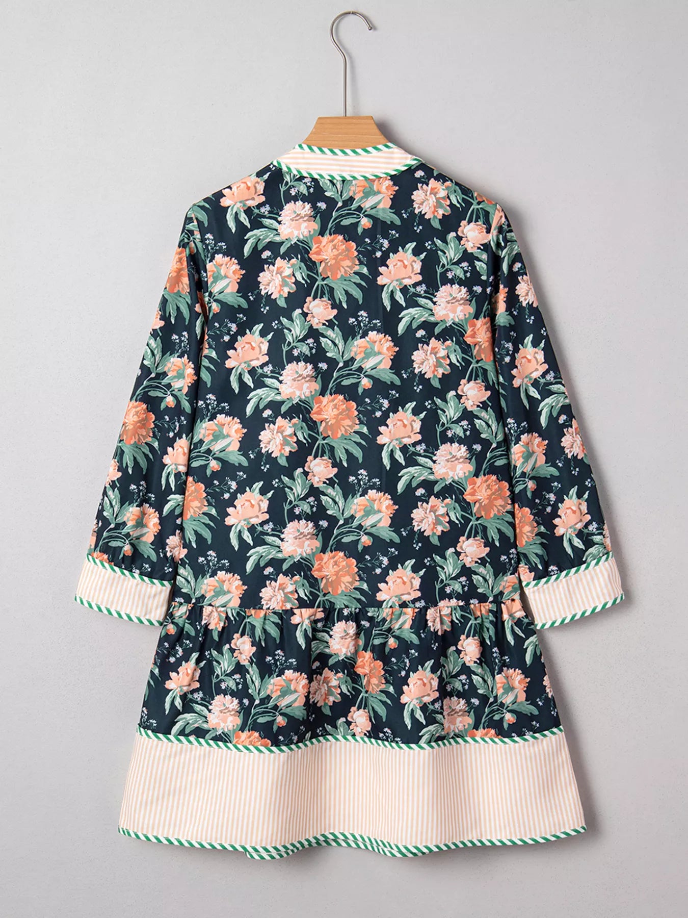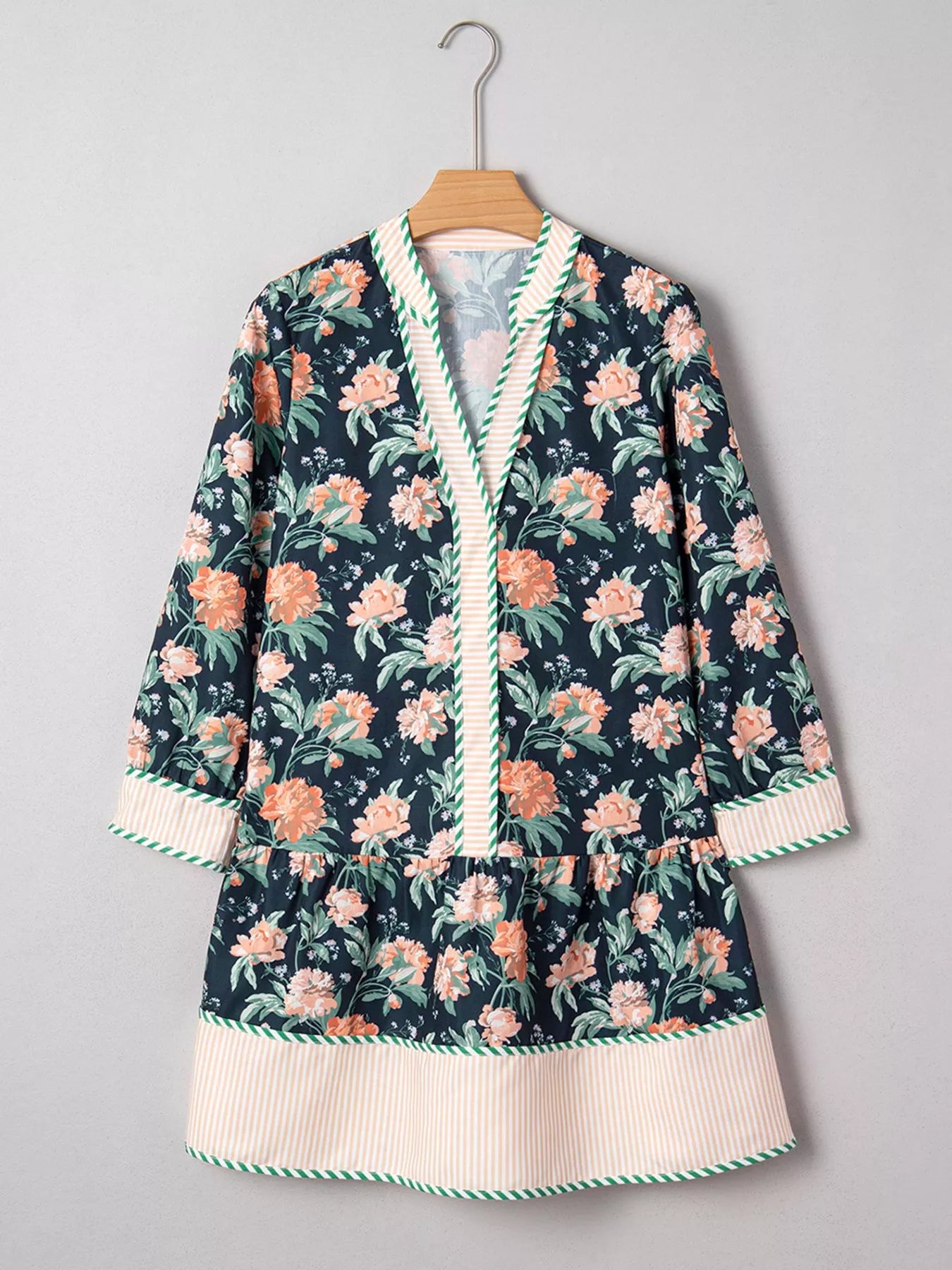 Floral Print Striped Trim V Neck Long Sleeve Ruffle Hem Shift Mini Dress