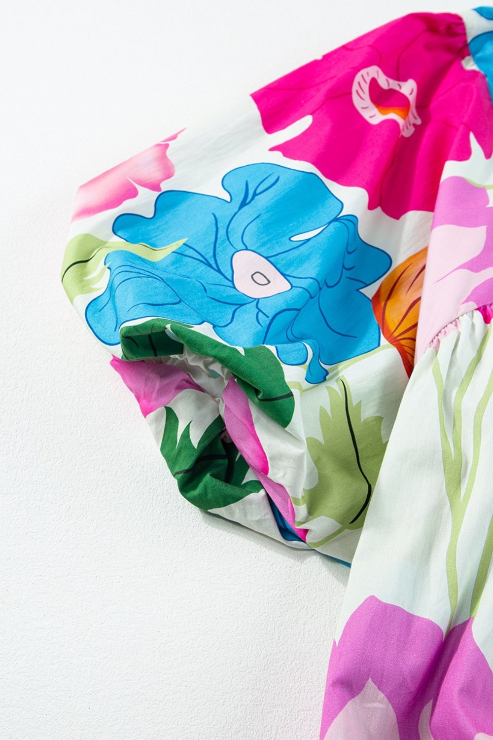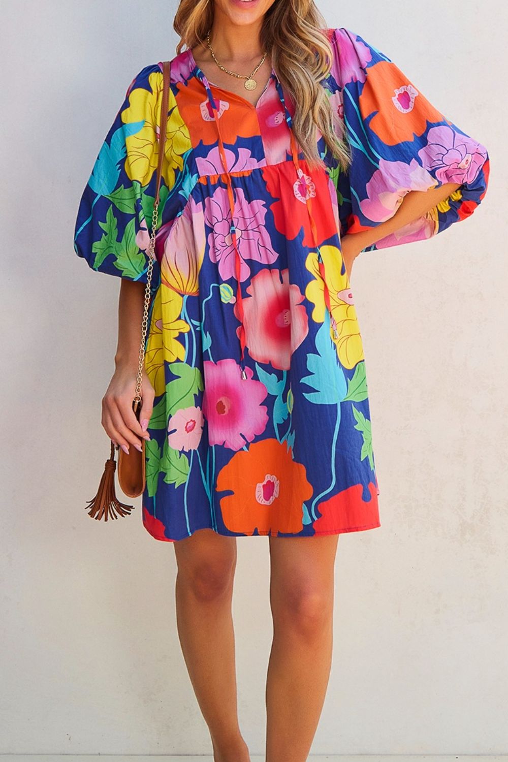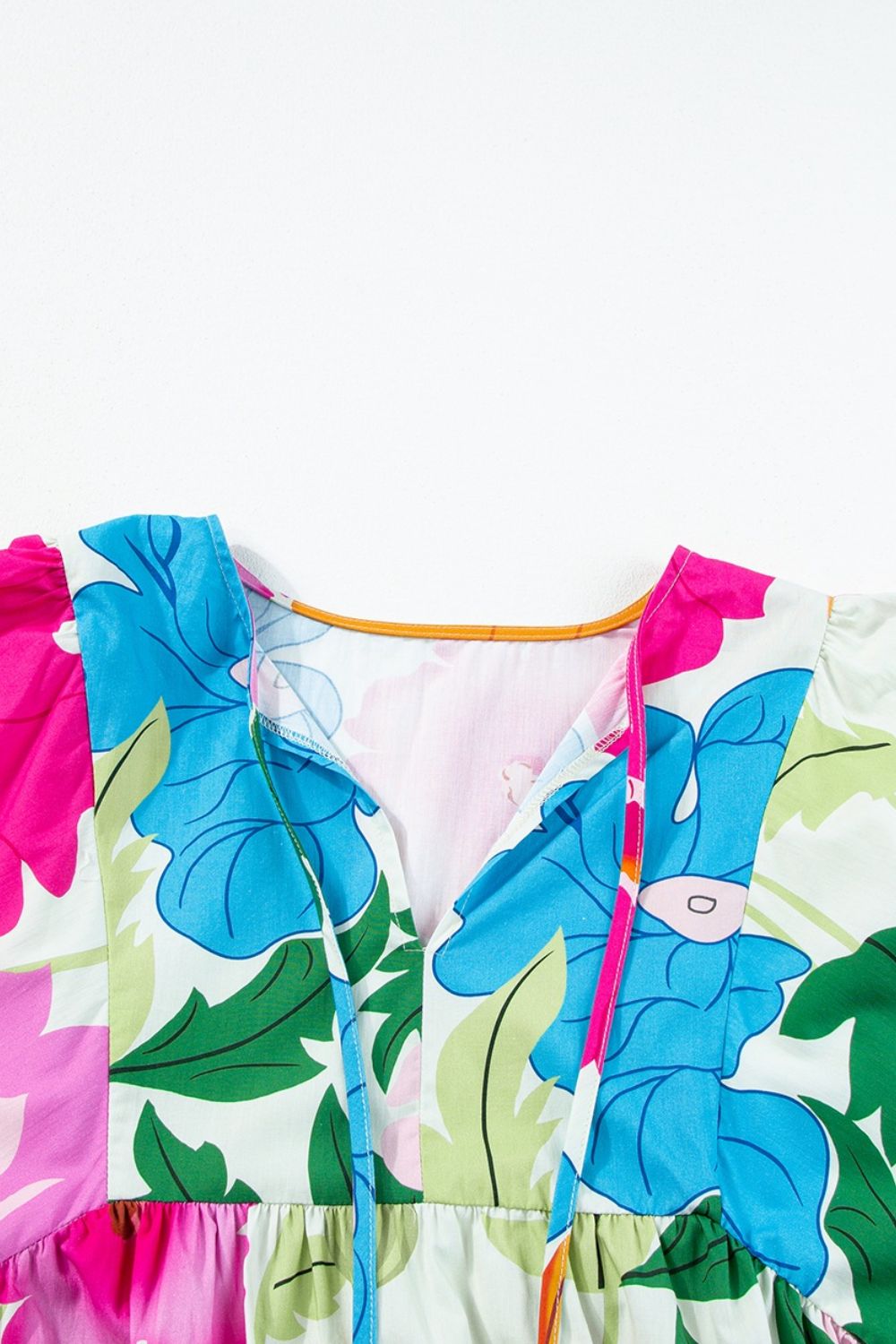 Floral Print Striped Trim V Neck Long Sleeve Ruffle Hem Shift Mini Dress
