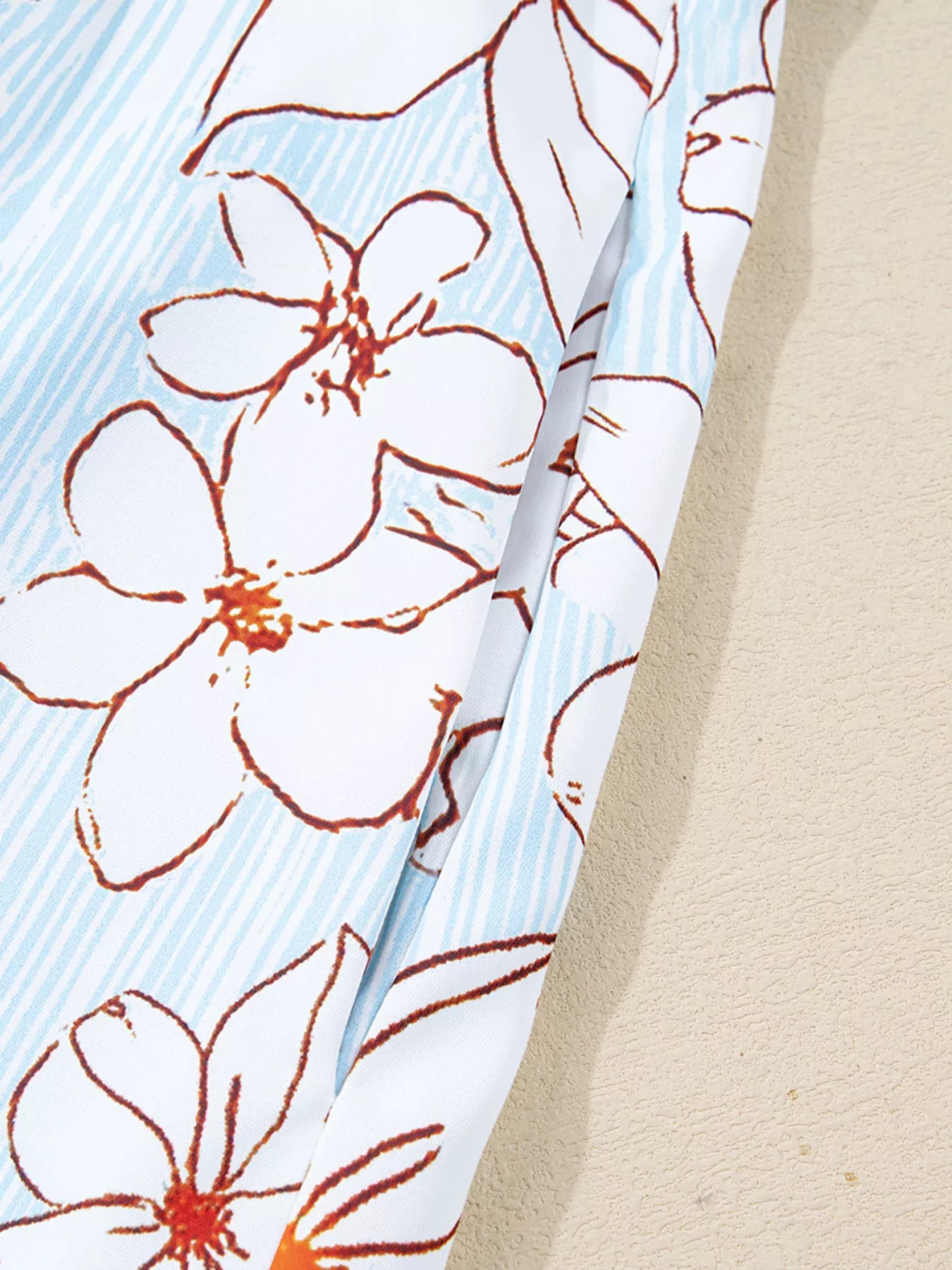 Floral Print Striped Trim V Neck Long Sleeve Ruffle Hem Shift Mini Dress