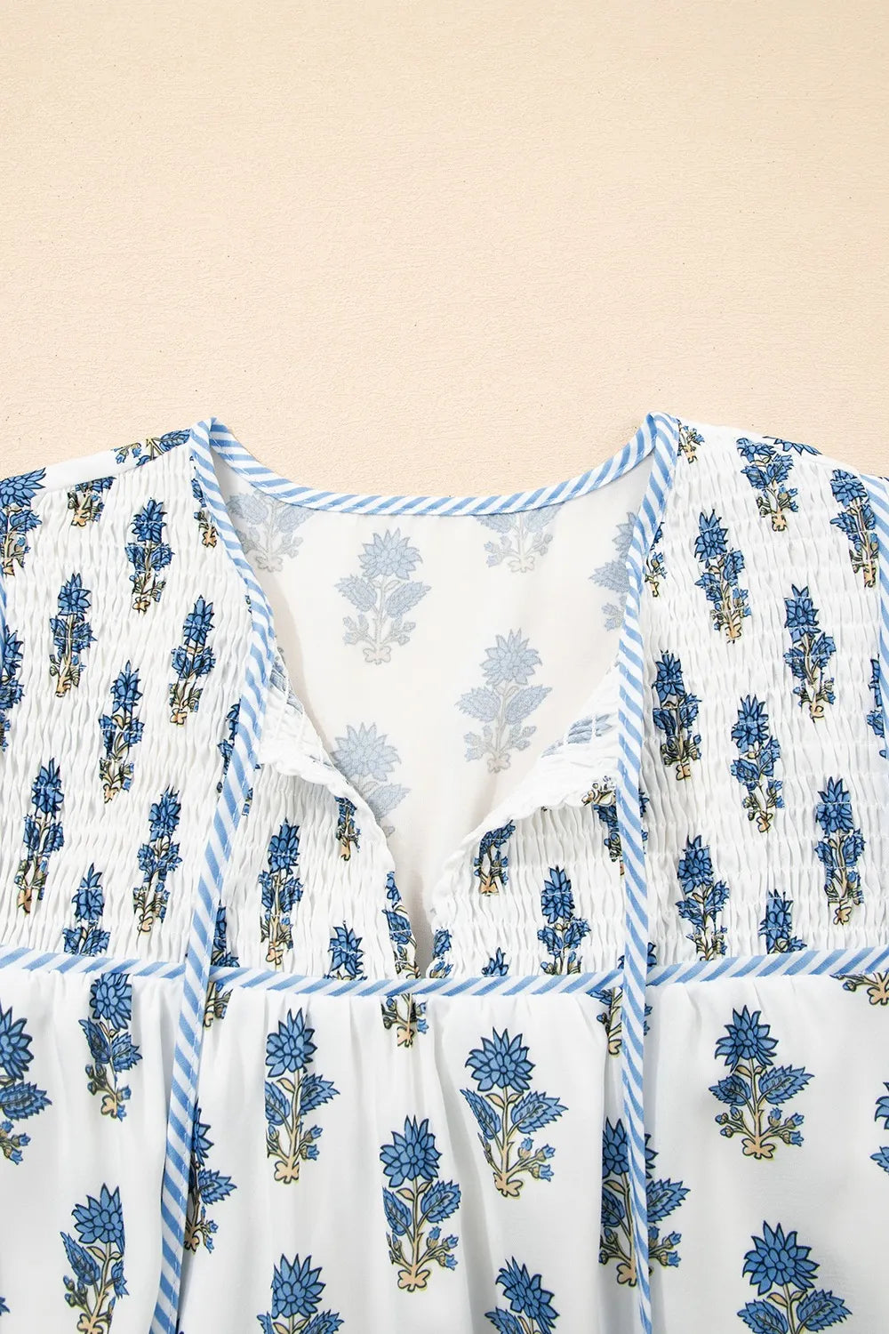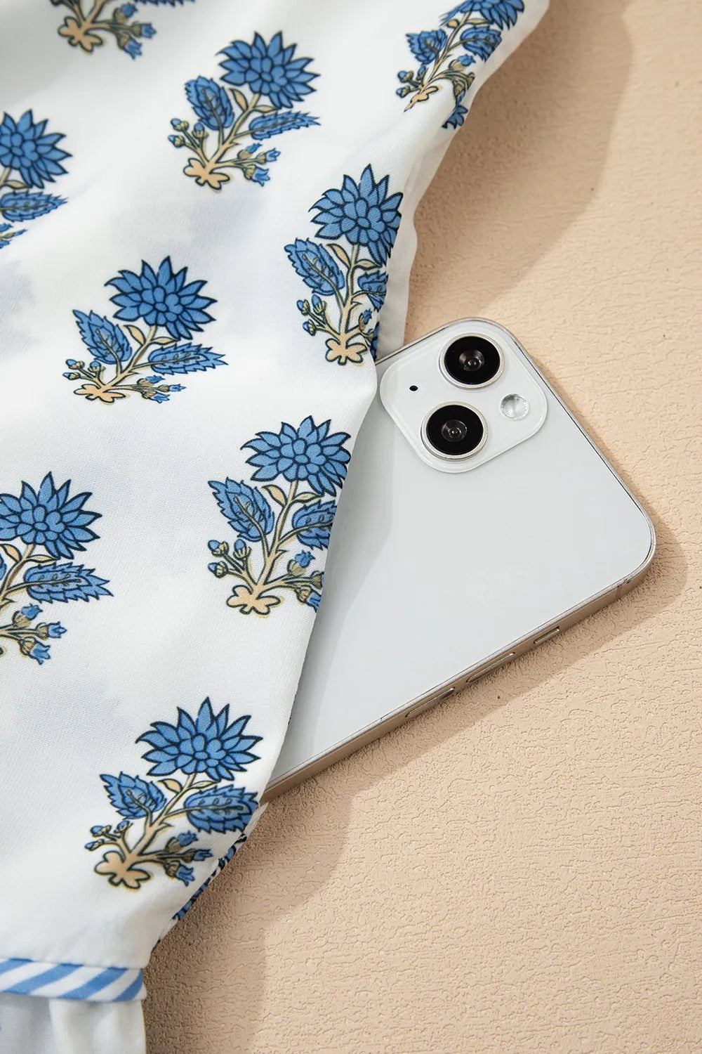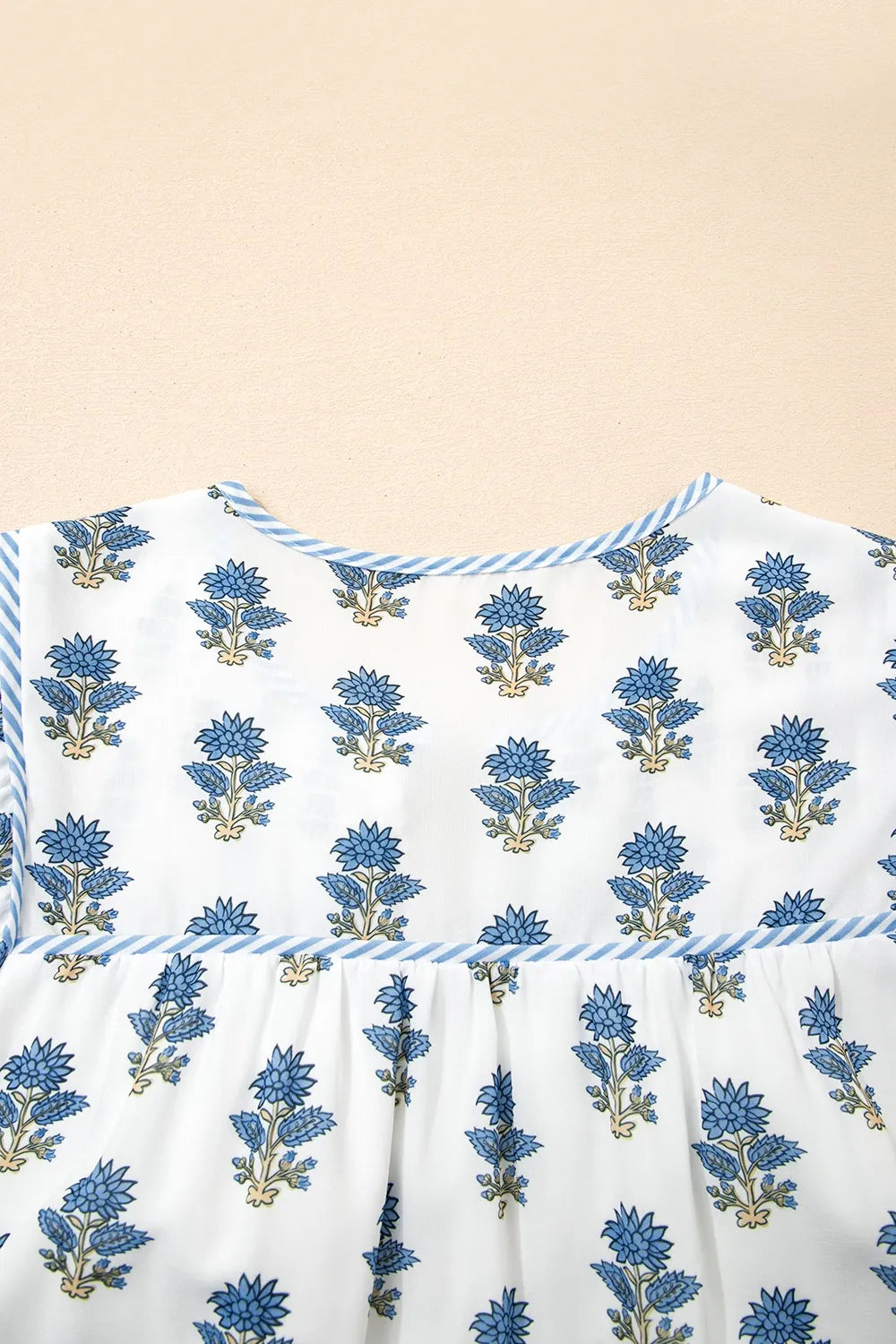 Floral Print Striped Trim V Neck Long Sleeve Ruffle Hem Shift Mini Dress