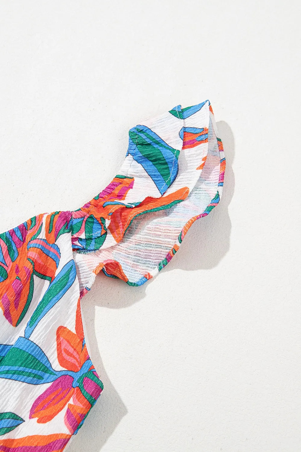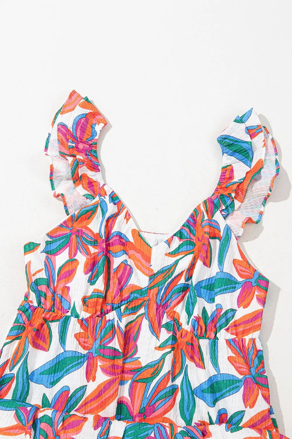 Floral Print Striped Trim V Neck Long Sleeve Ruffle Hem Shift Mini Dress