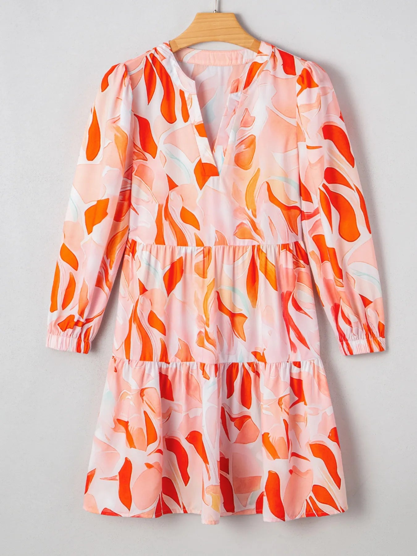 Floral Print Striped Trim V Neck Long Sleeve Ruffle Hem Shift Mini Dress