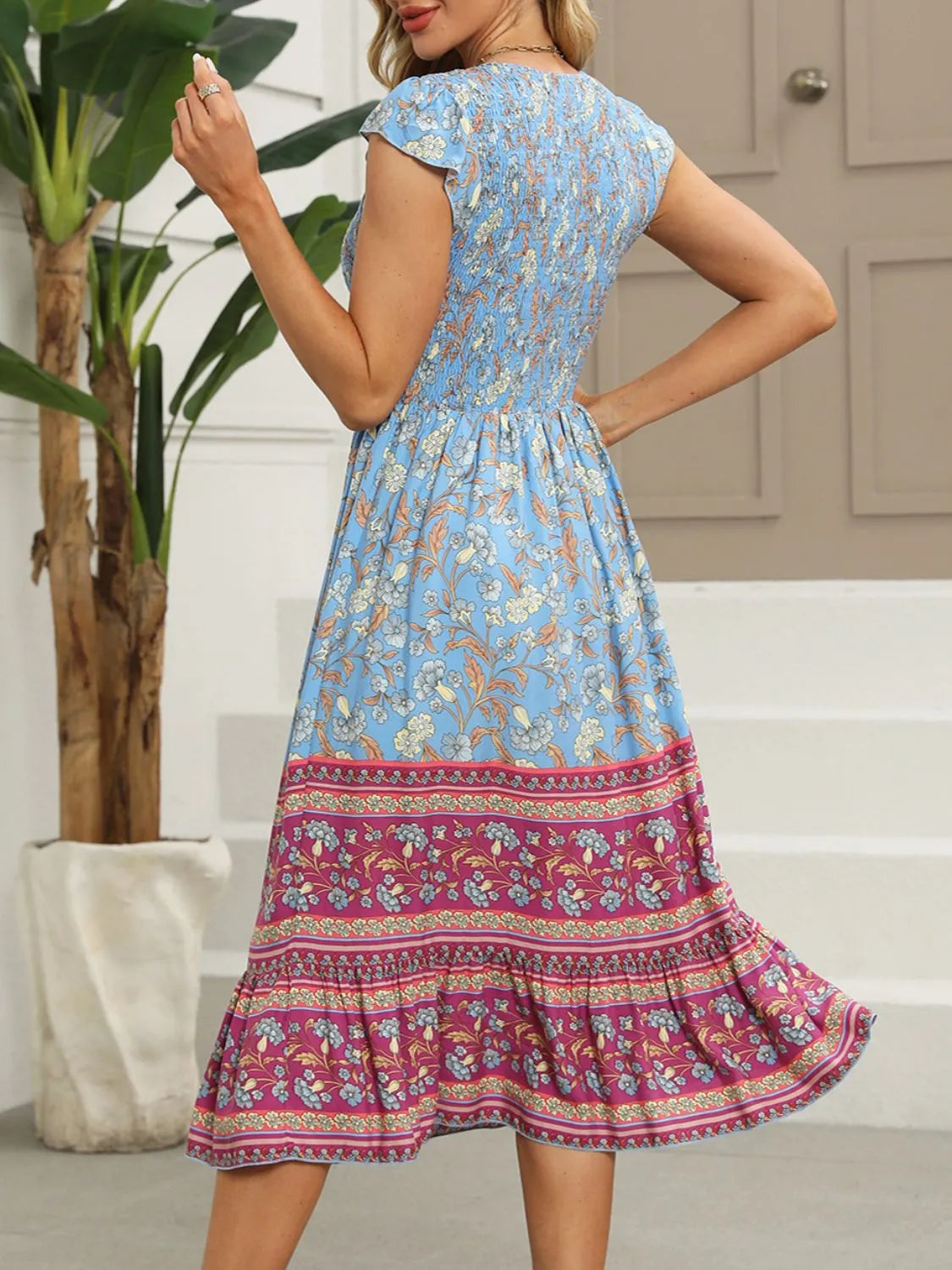 Floral Print Striped Trim V Neck Long Sleeve Ruffle Hem Shift Mini Dress