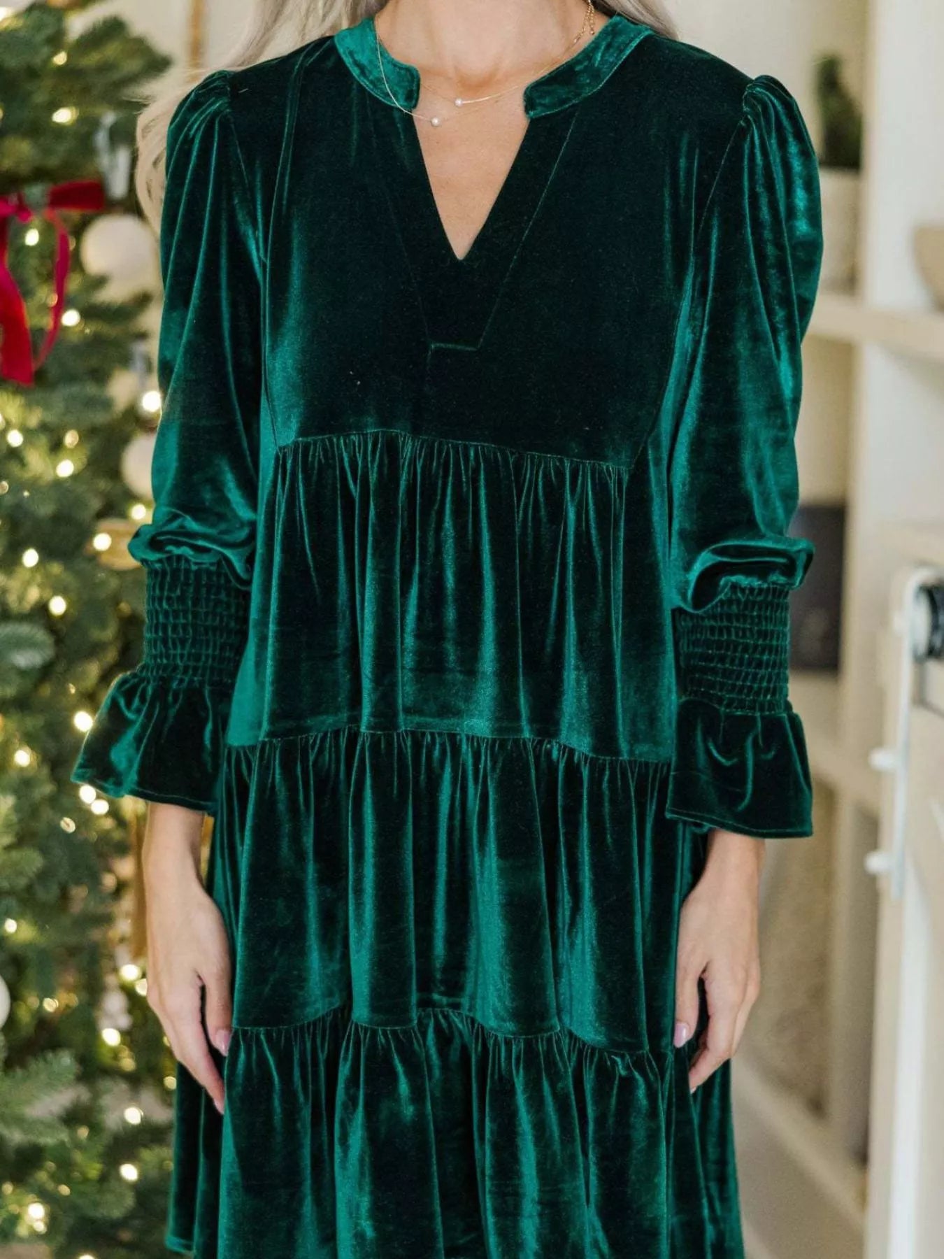 Floral Print Striped Trim V Neck Long Sleeve Ruffle Hem Shift Mini Dress
