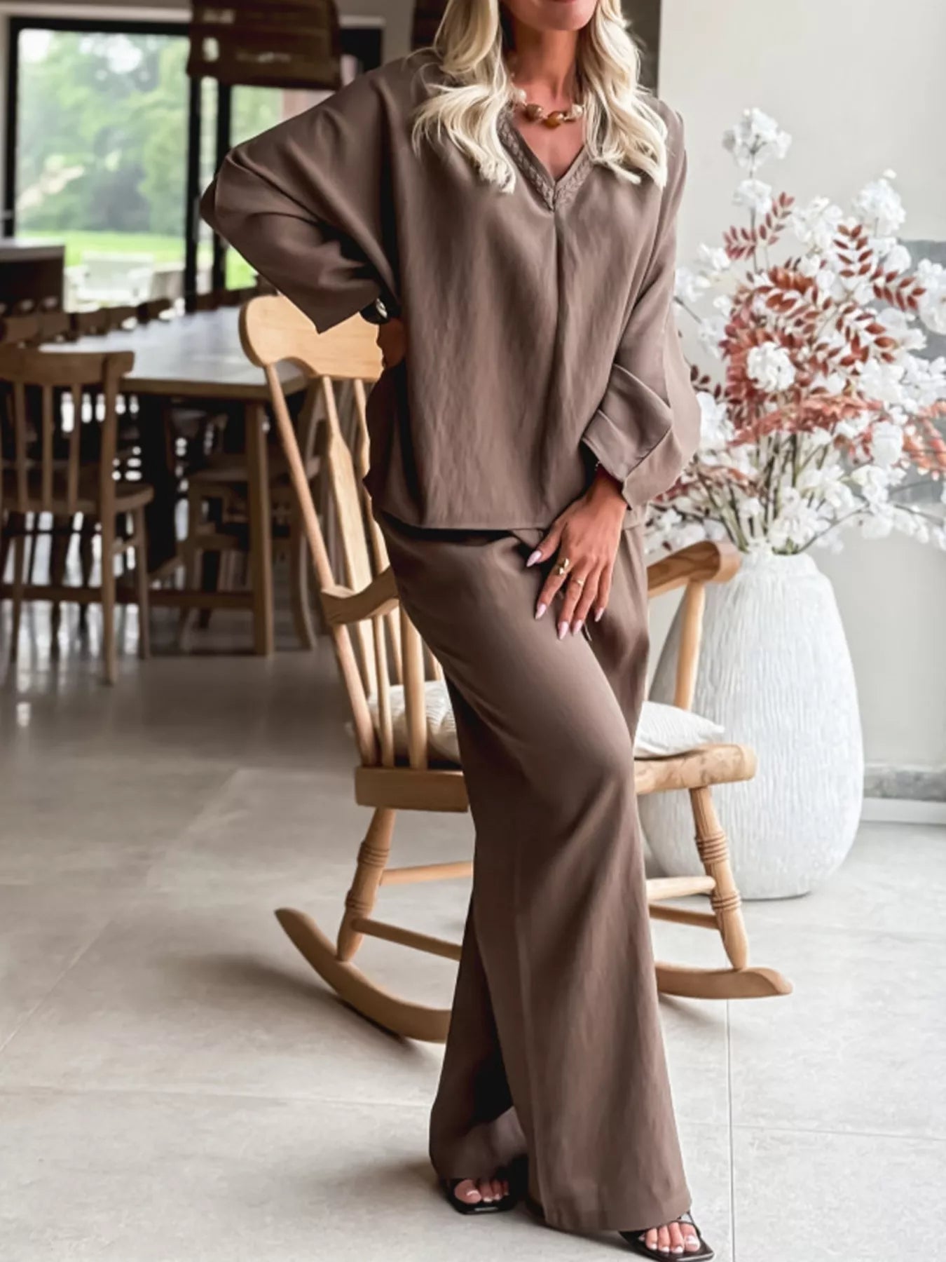 Braided V Neck Long Sleeve Loose Top and Drawstring High Waist Pants 2pcs Outfit