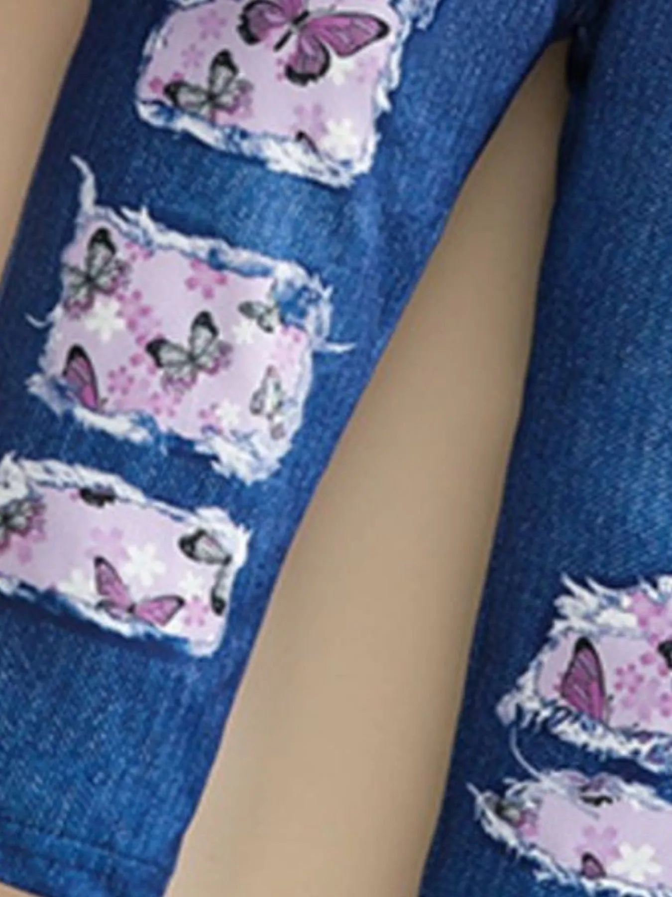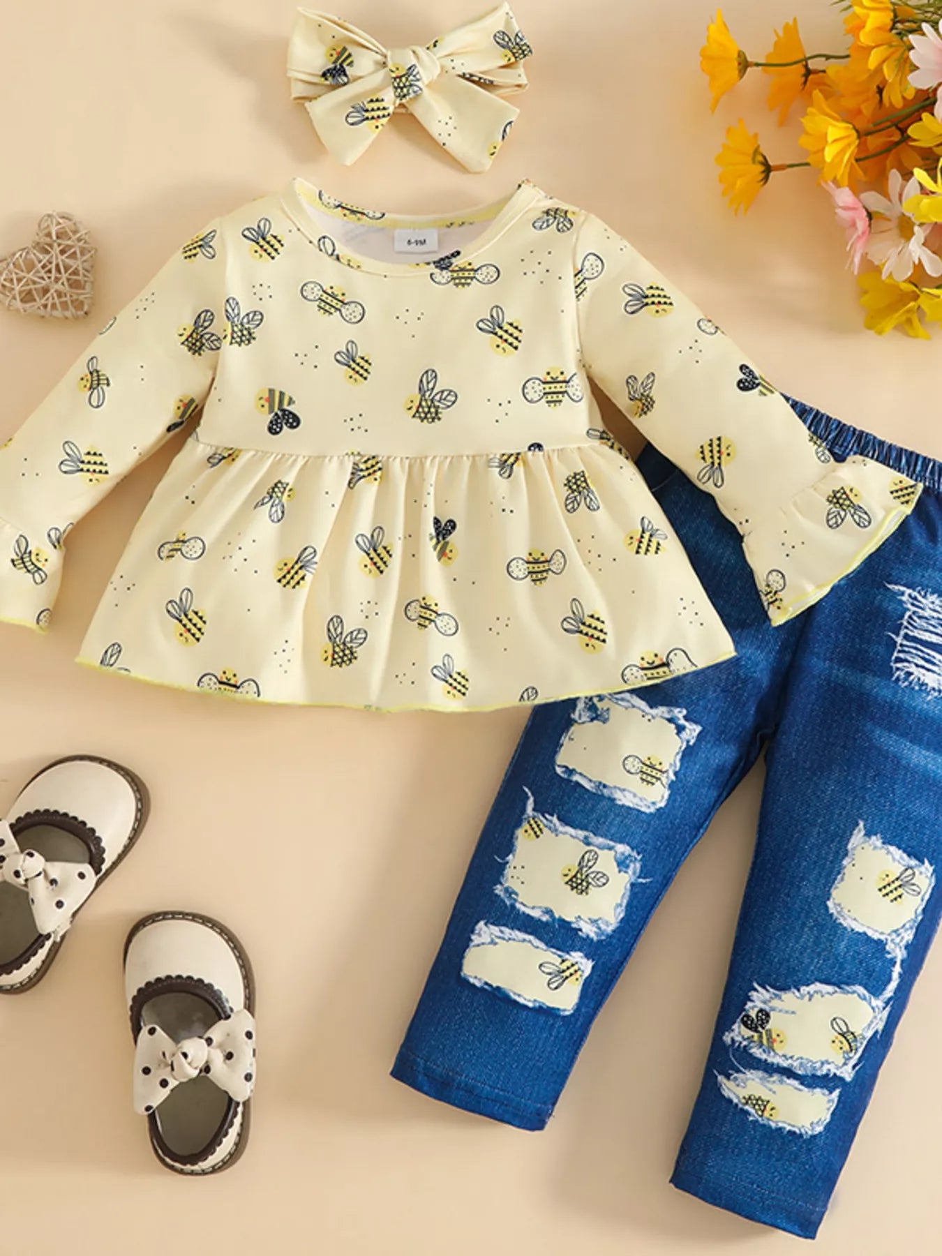 Children's Ladybug Print Ruffle Hem Top & Jeans Set with Headband