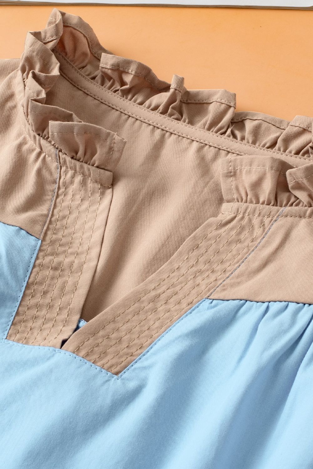 Color Block Notched Ruffled Cap Sleeve Blouse