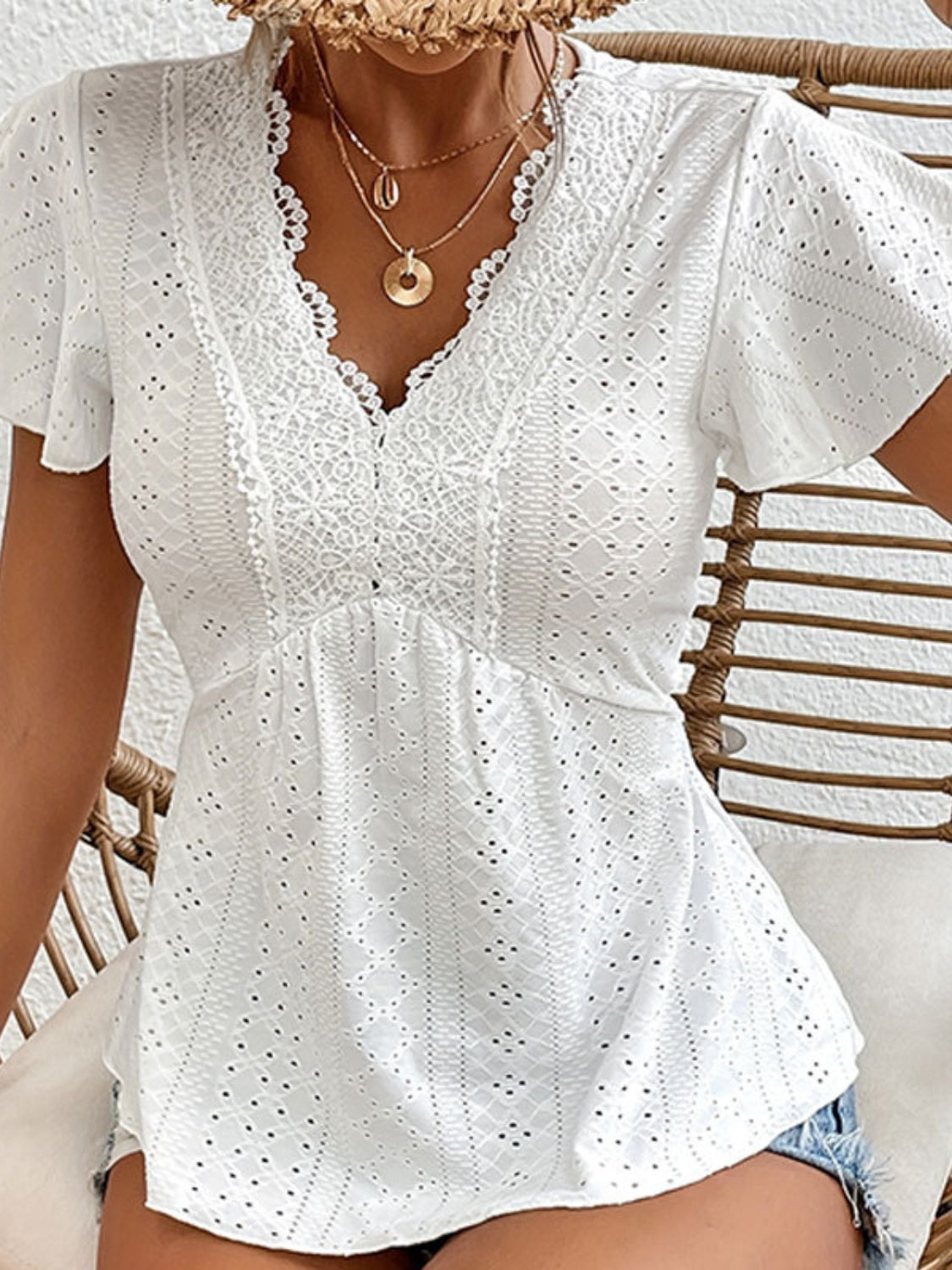 Eyelet Lace Detail V-Neck Short Sleeve Blouse