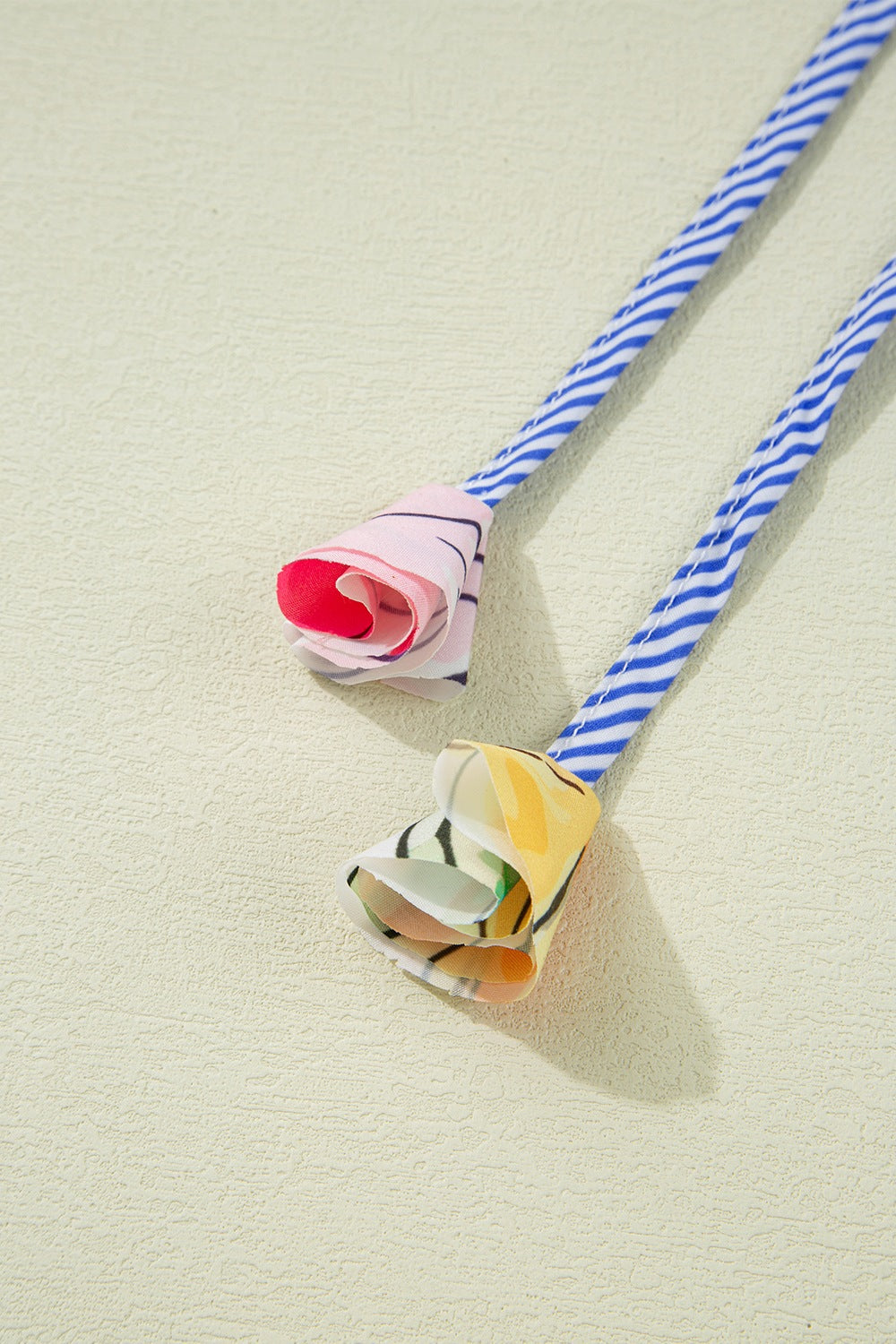 Floral Striped Yoke Frilled Tie Neck Puff Short Sleeve Blouse