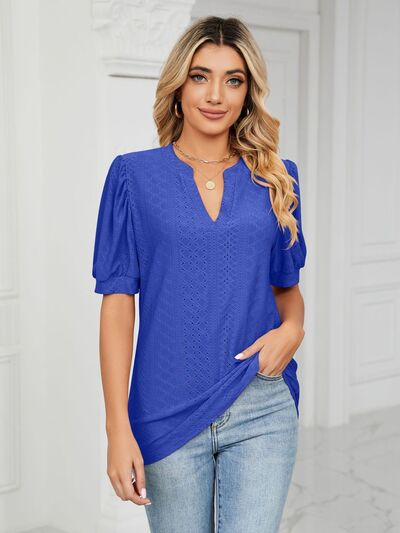Florira Eyelet Notched Short Sleeve T-Shirt