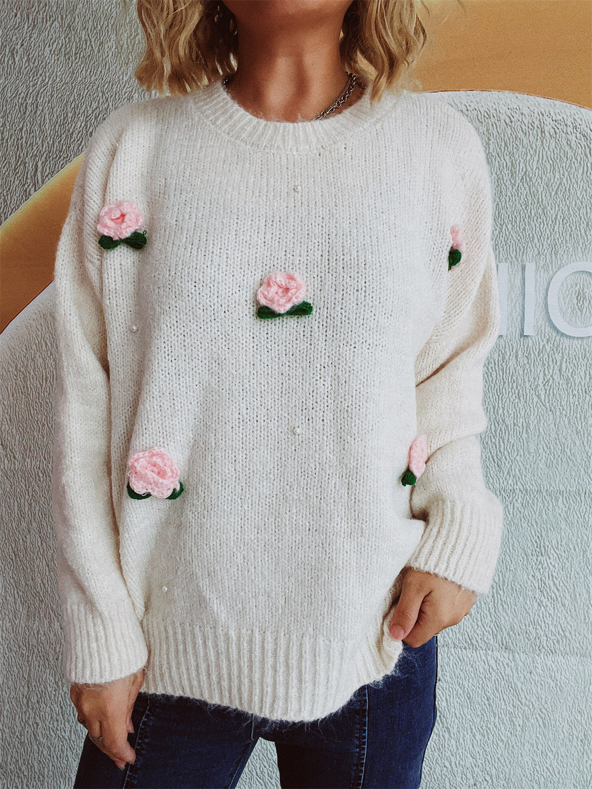 Flower Round Neck Long Sleeve Sweater