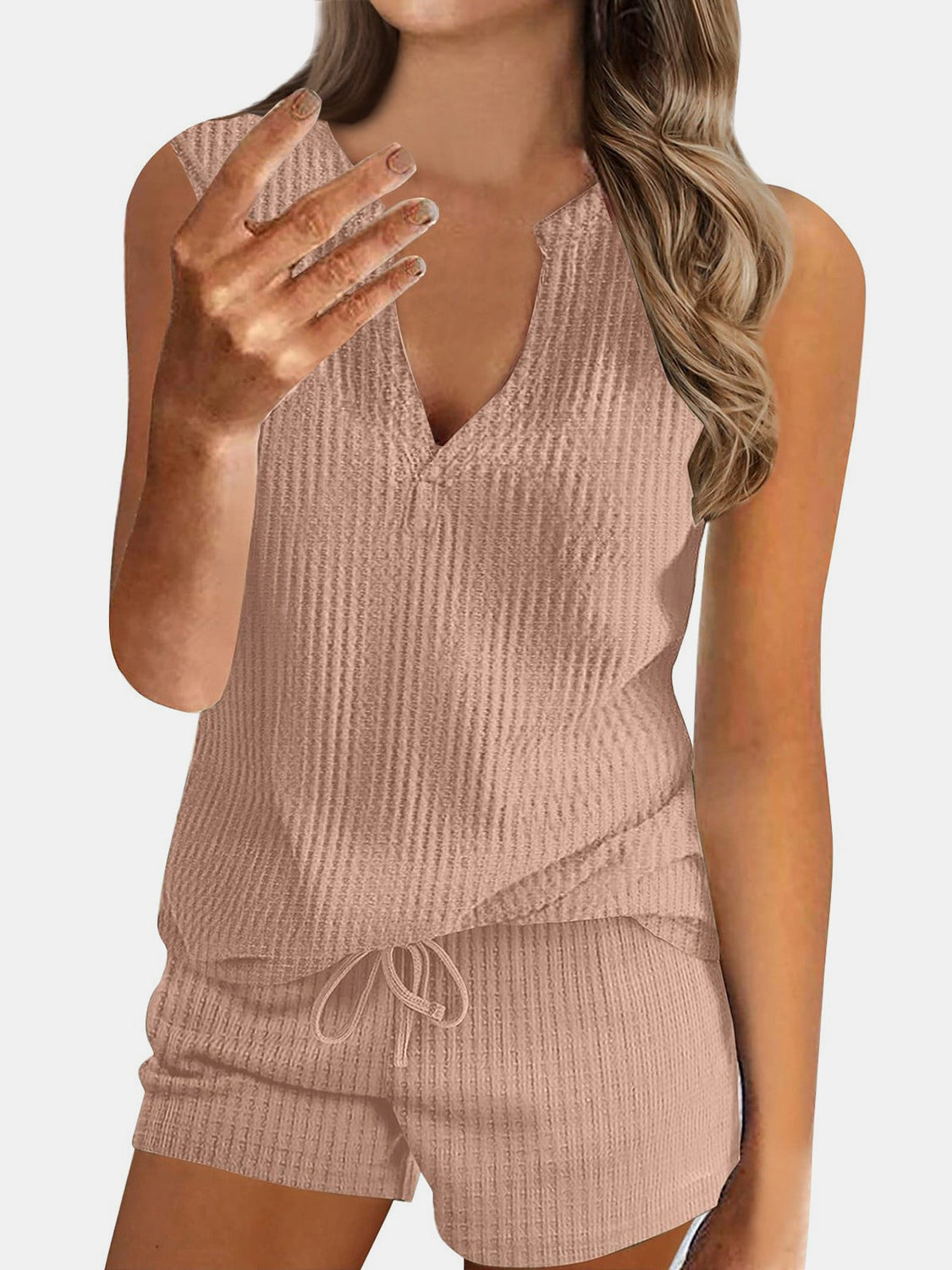 Full Size Waffle-Knit Notched Top and Shorts Set