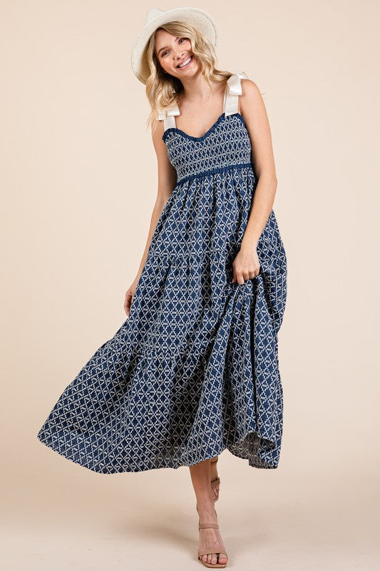 GeeGee Geometric Embroidered Smocked Tie Shoulder Midi Dress