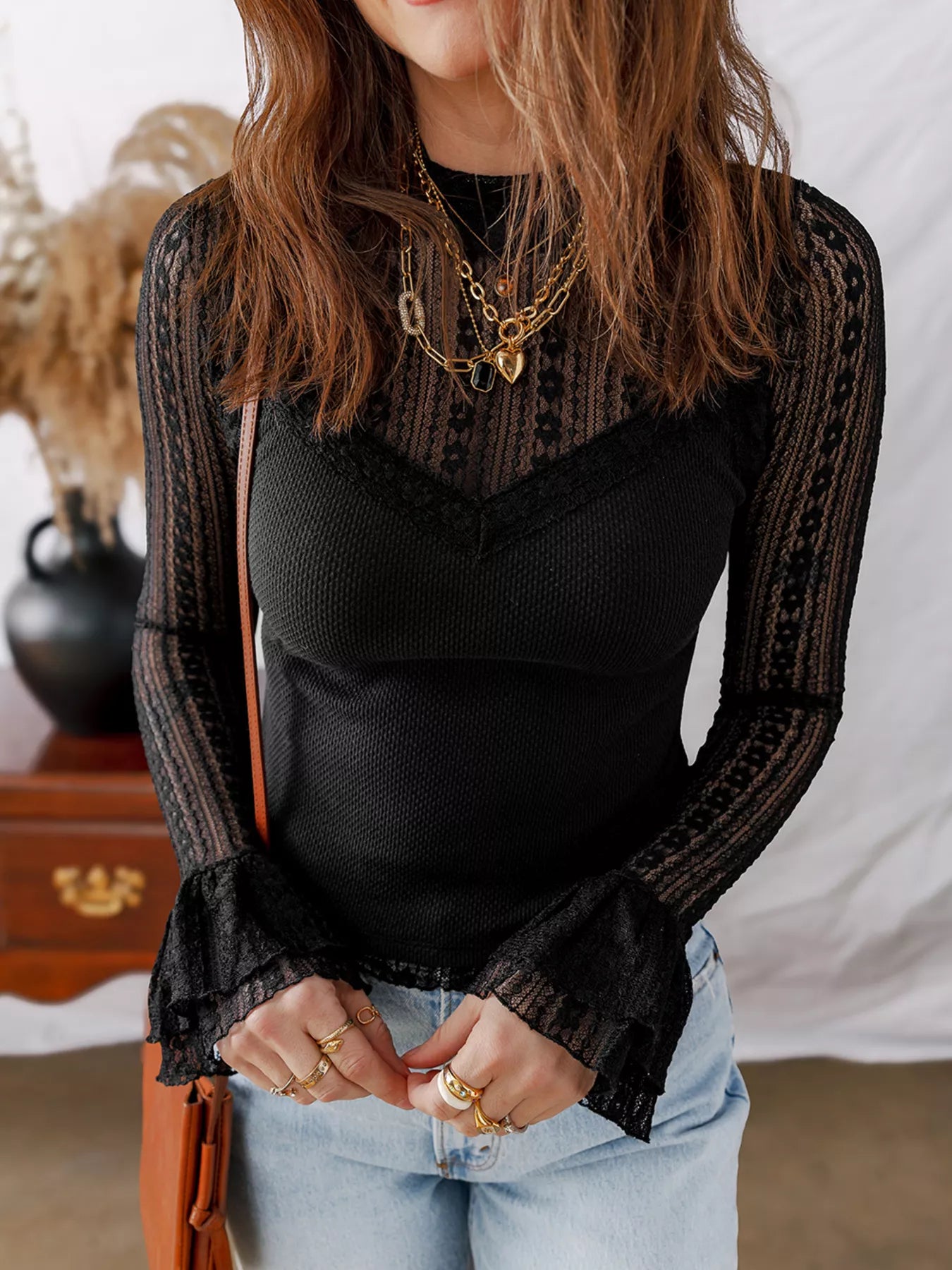 Lace Patchwork Flounce Sleeve Slim Fit Top