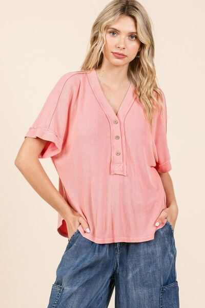 Mittoshop Mineral Wash Henley Short Sleeve Waffle Knit Top