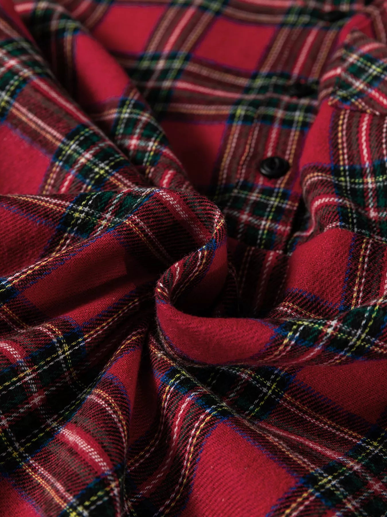 Plaid Shirt Collar Half Button Ruffle Hem Long Sleeve Mini Dress
