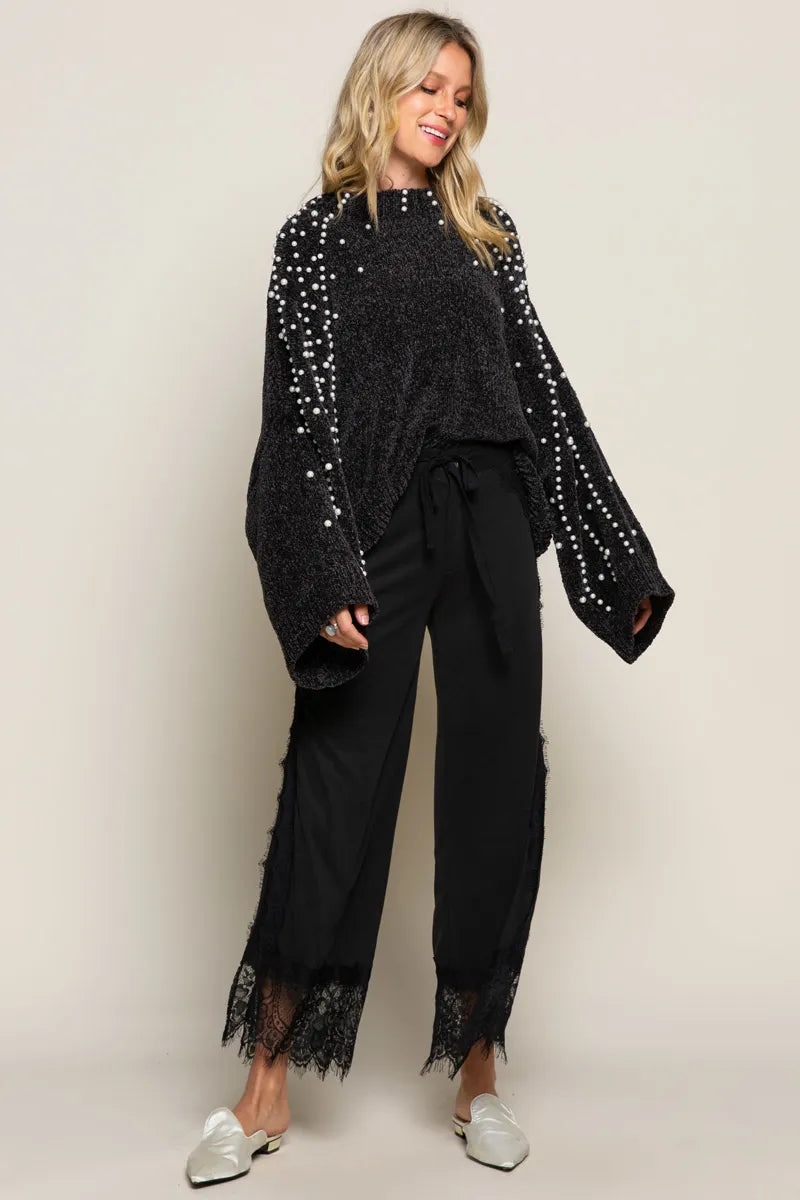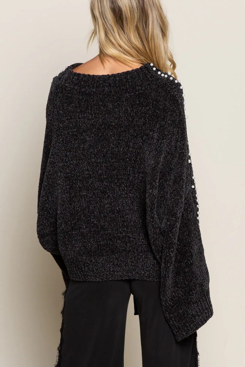This stunning black pullover sweater features an oversized silhouette crafted from soft, comfortable knit material. The standout feature is the elegant pearl embellishments scattered across the sleeves, creating a luxurious and sophisticated look. The mock neckline adds a modern touch while the relaxed fit ensures all-day comfort. Perfect for both casual and dressy occasions, this versatile piece combines cozy warmth with glamorous style. The high-quality knit construction provides durability and maintains its shape, making it an essential addition to any fashion-conscious wardrobe.