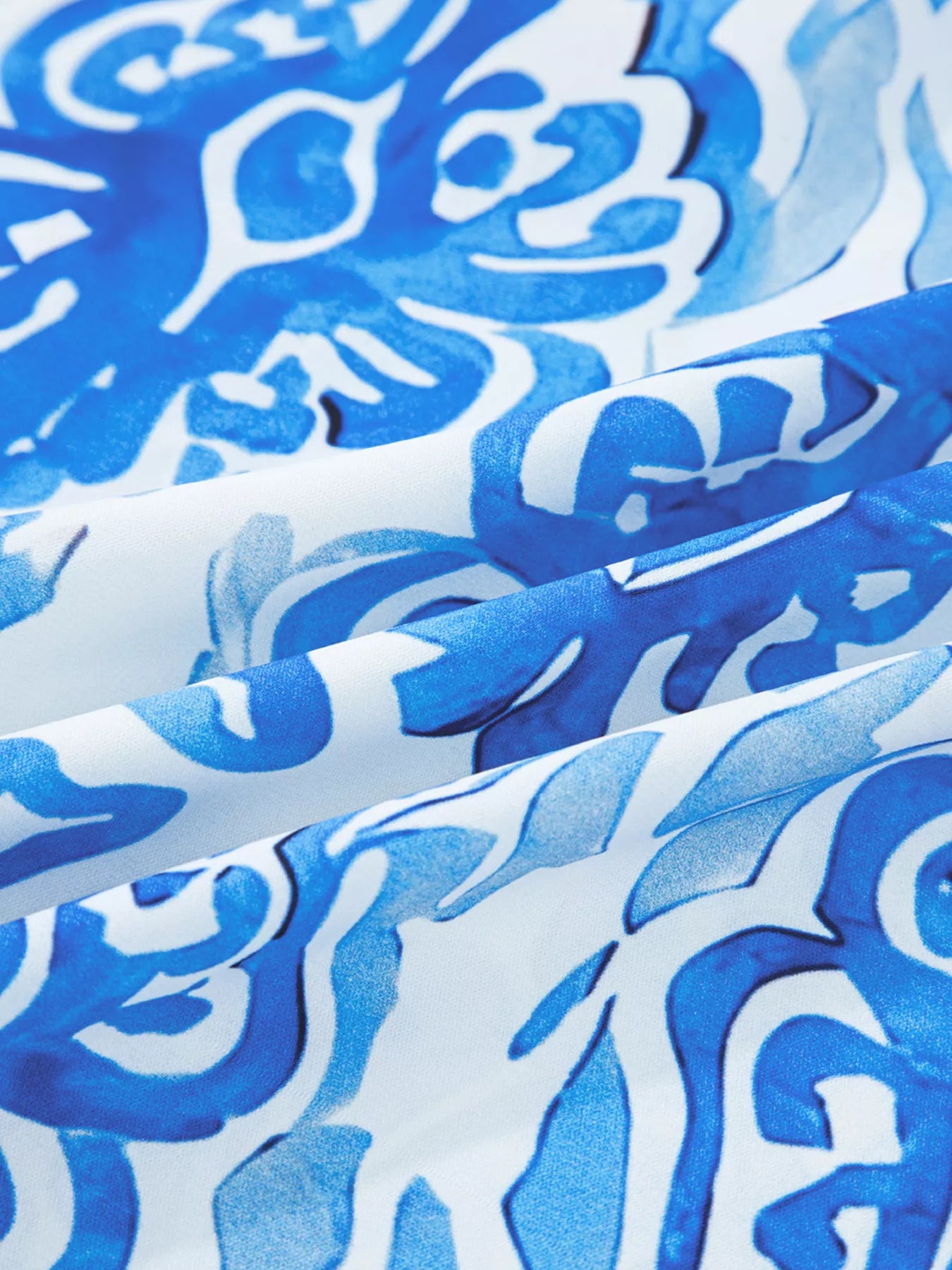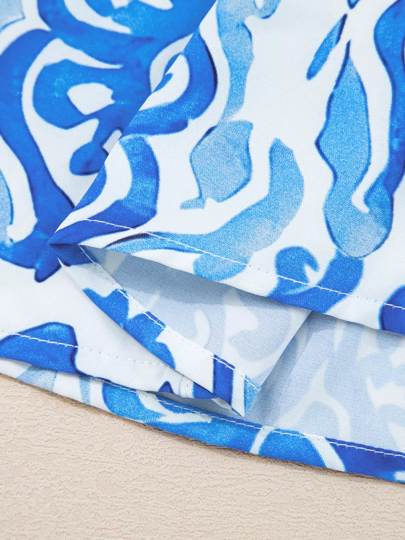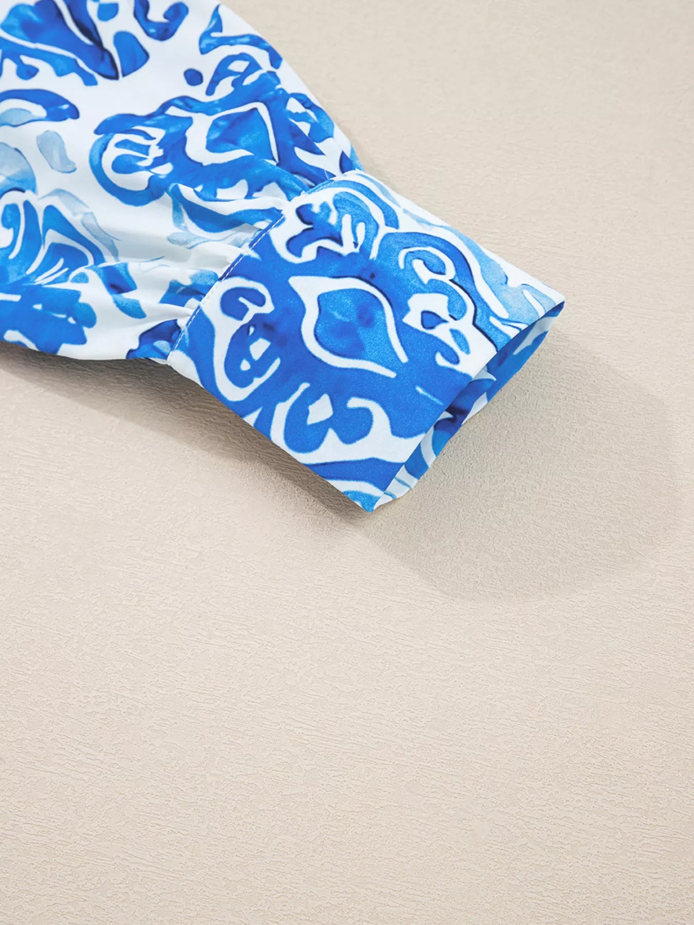 Printed Tie Split Neck Button Front Puff Sleeve Shirt
