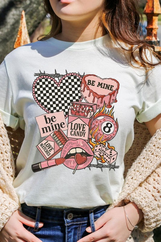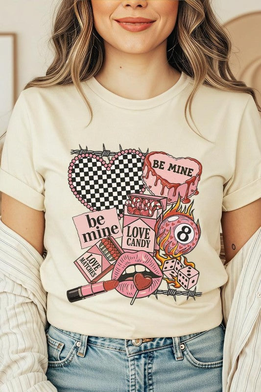 valentine graphic tee, candy collage shirt, retro love icons top, western style valentine tee, western inspired graphic shirt, cowboy western aesthetic, heart themed apparel, boutique seasonal wear, cute romantic graphic, holiday casual style Graphic Tee.