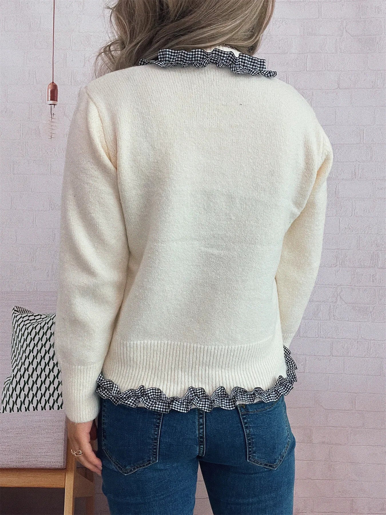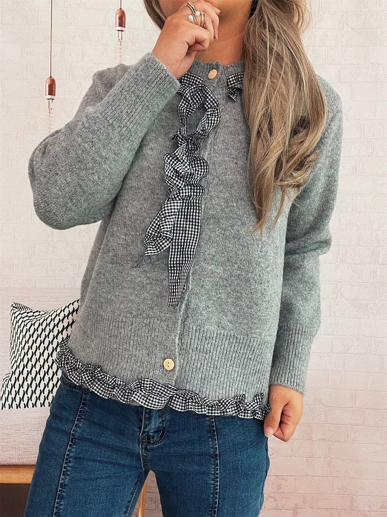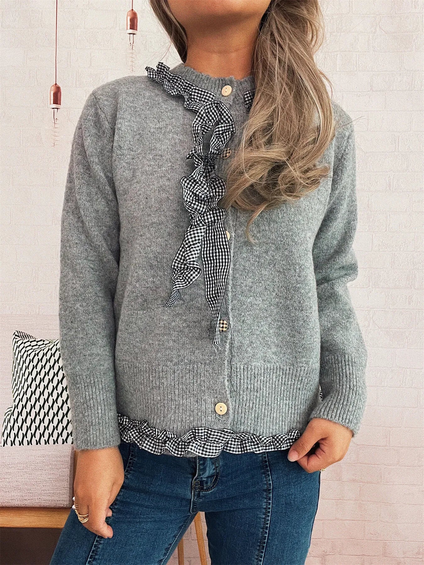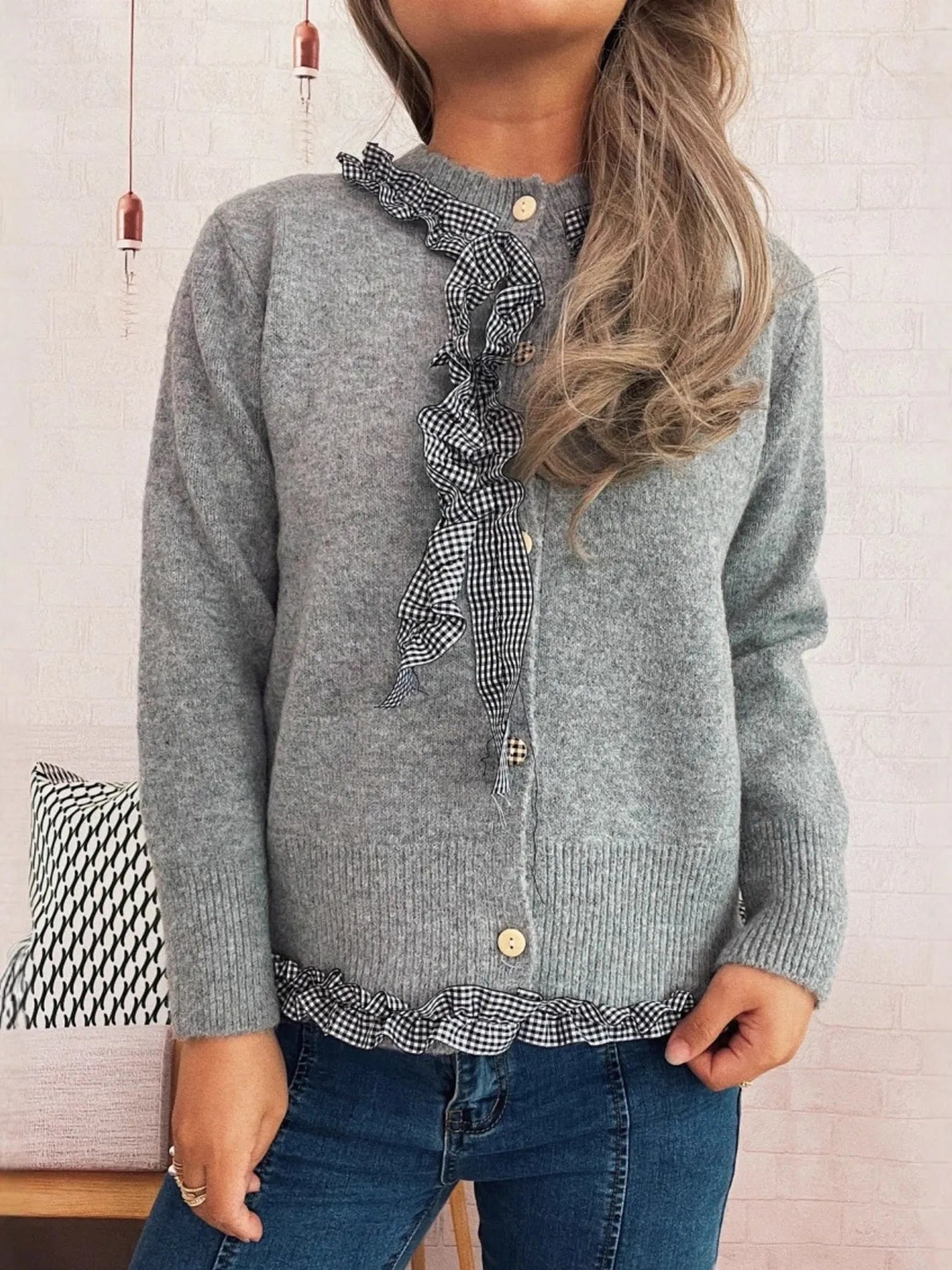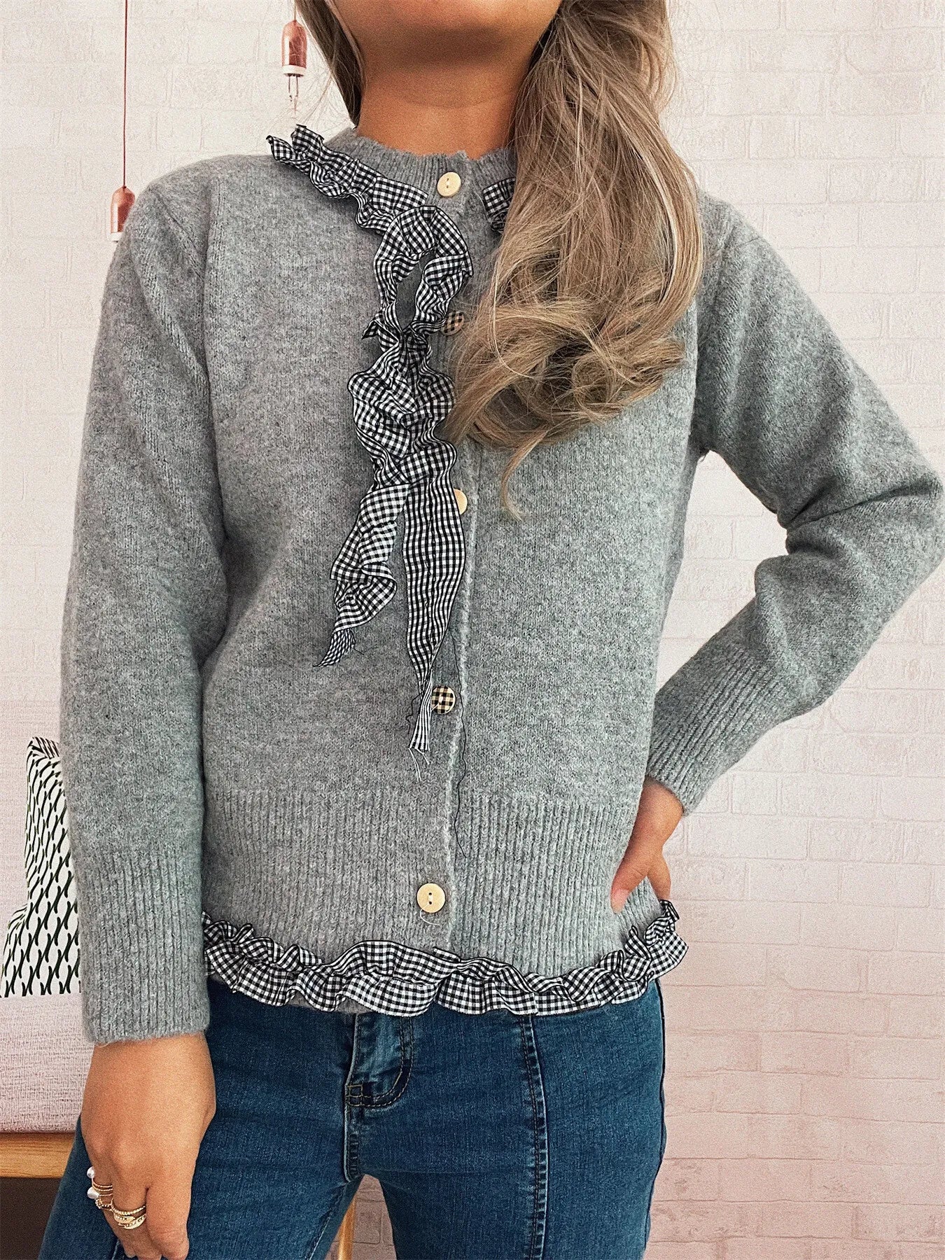 Ruffle Trim Gingham Cardigan