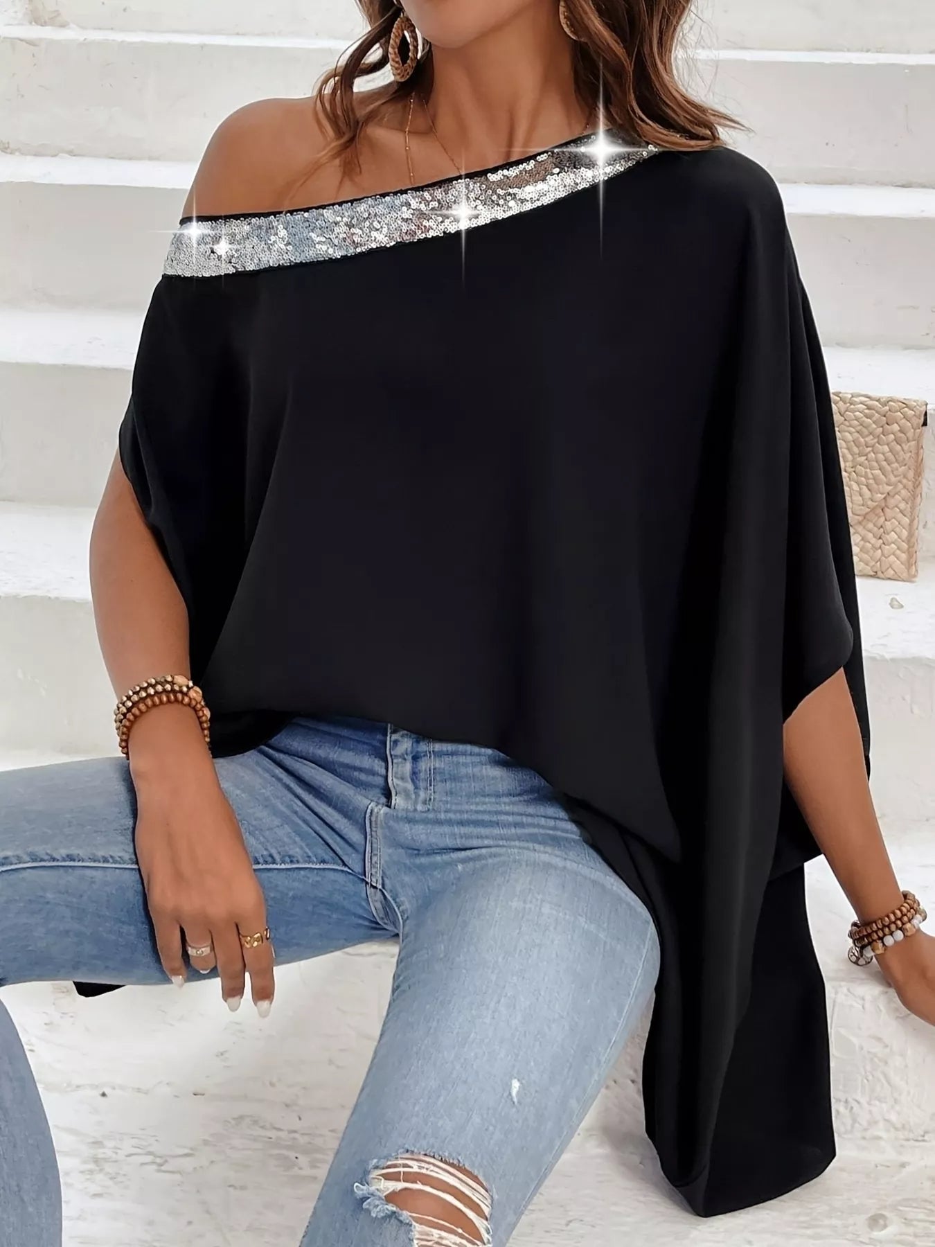 Sequined One Shoulder Batwing Sleeve Blouse