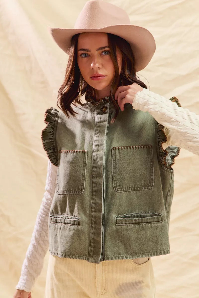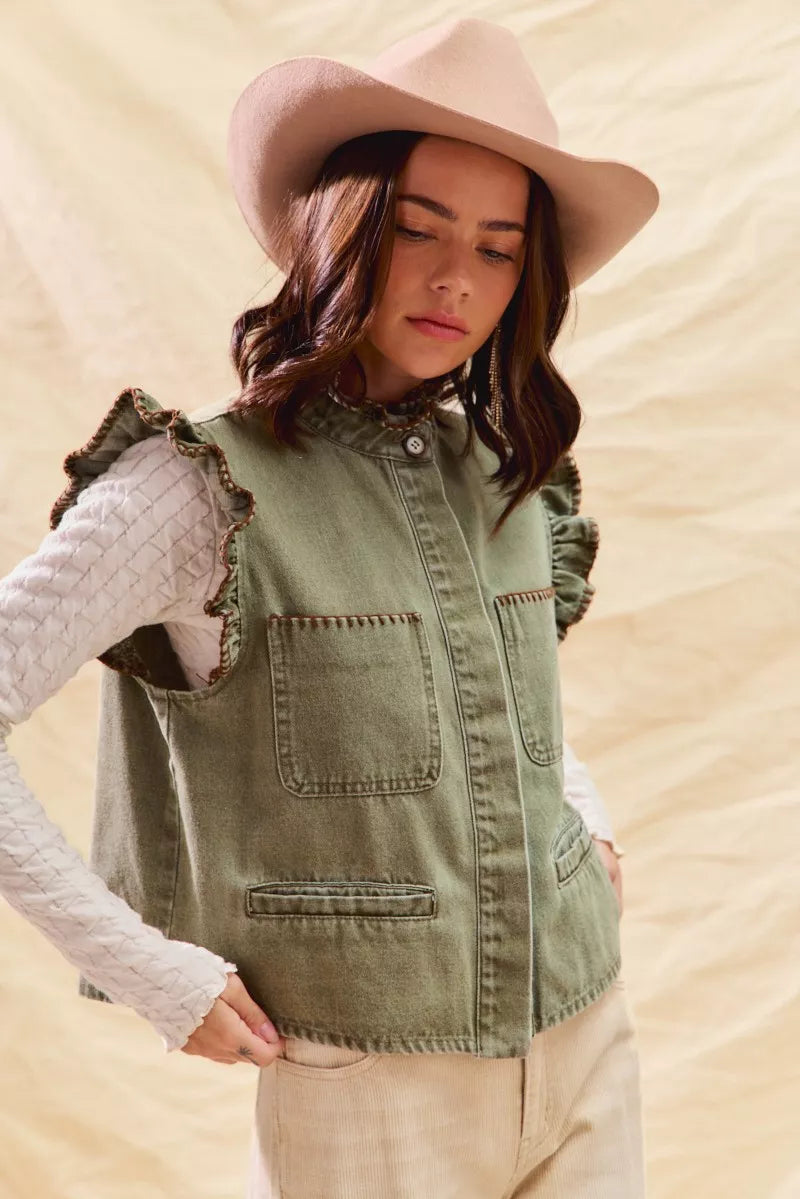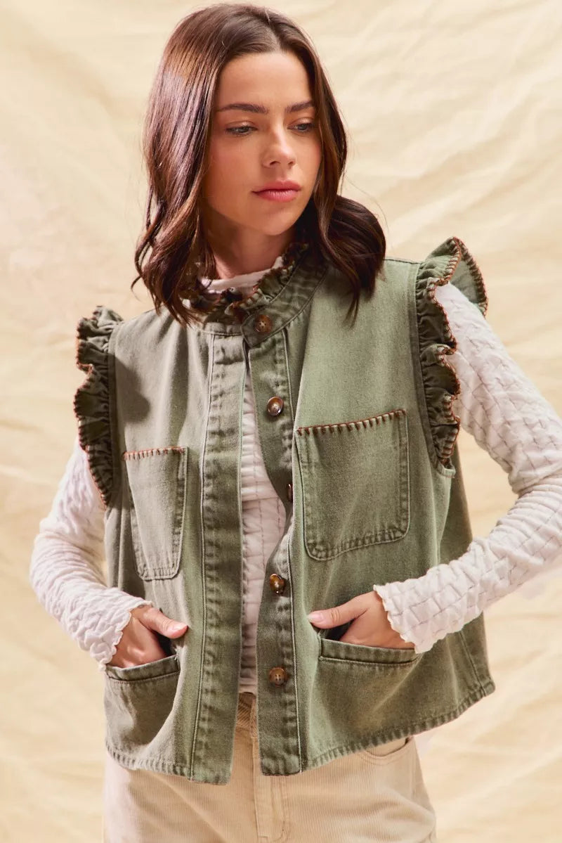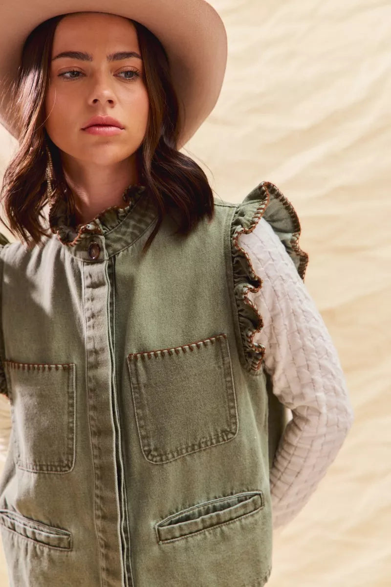 SO ME Washed Denim Stitch Ruffled Hidden Button Vest Top