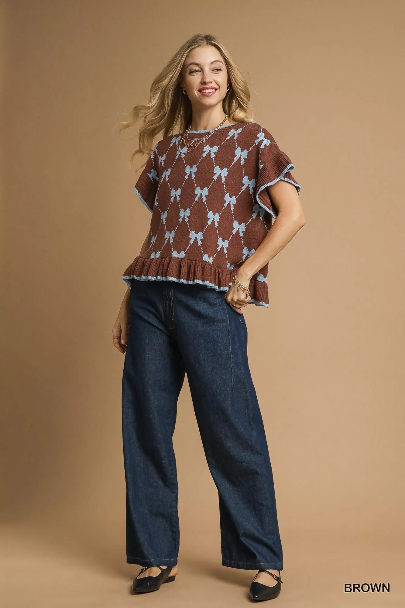 Umgee Bow Knit Ruffle Sleeve Sweater
