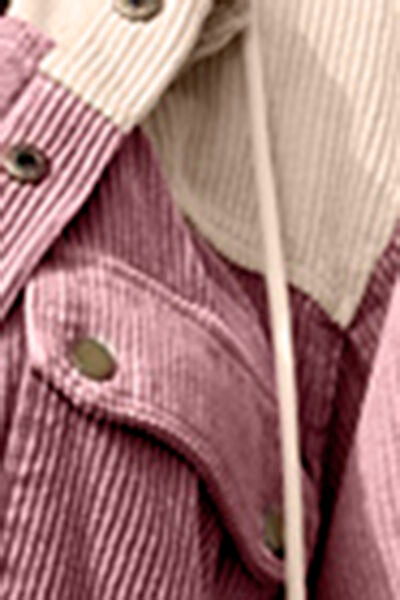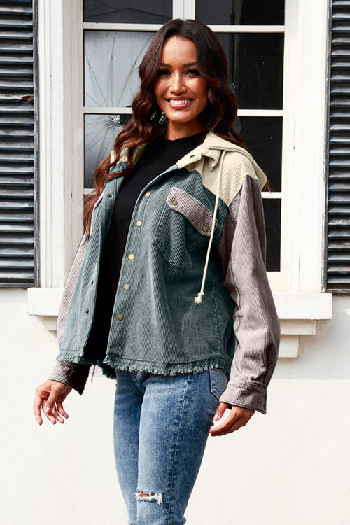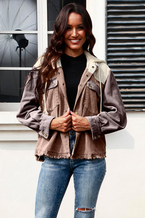 Contrast Drawstring Snap Down Raw Hem Hooded Jacket