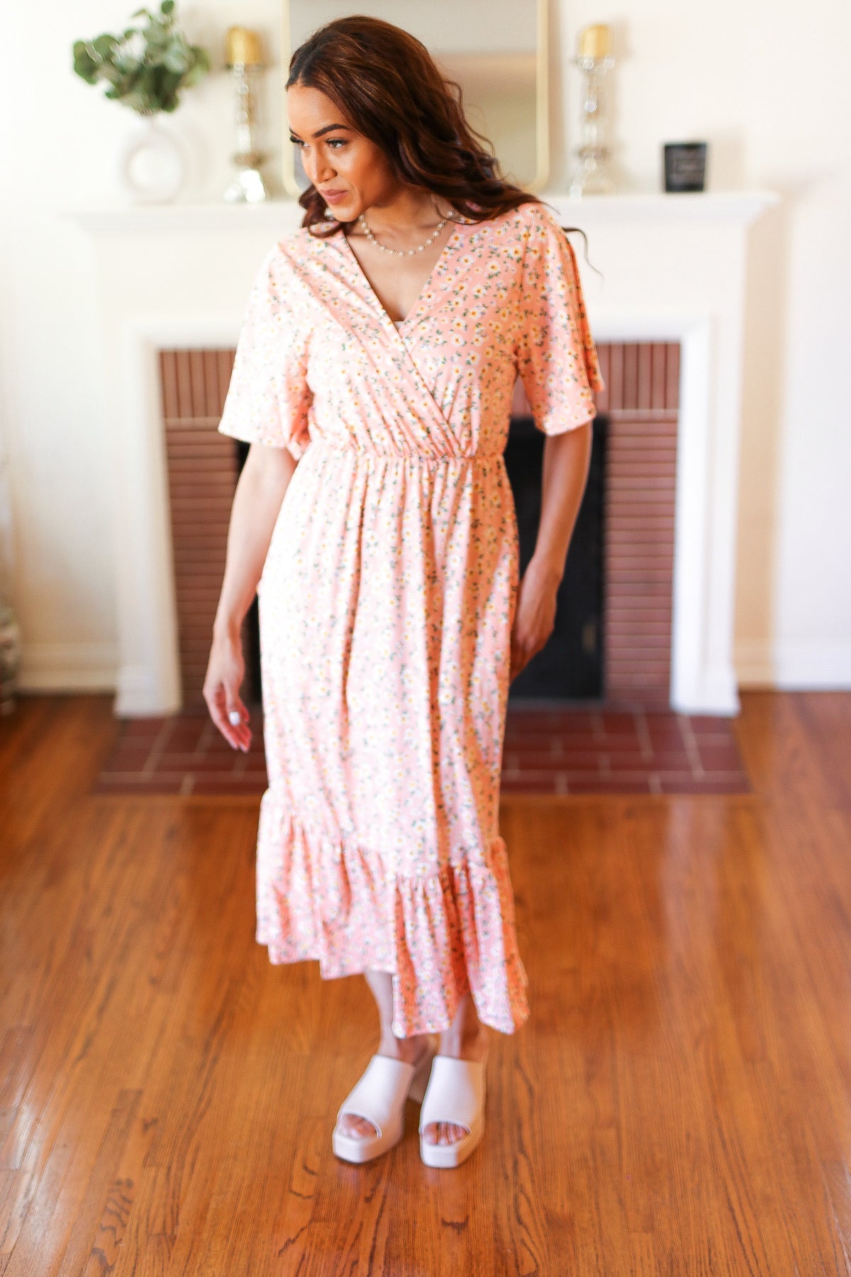 Fall in love with this peach soft knit floral maxi dress featuring a flattering elastic waist and surplice neck. With a fit and flare design, cozy side pockets and a stunning ruffle hem, wear for any occasion!
