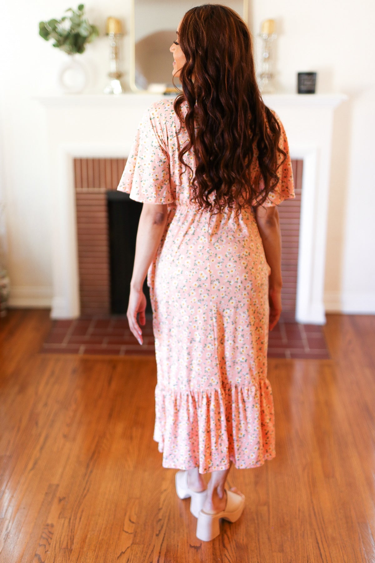 Peach Floral Surplice Elastic Waist Ruffle Maxi Dress