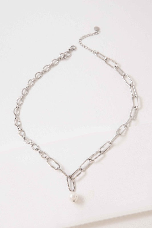 An asymmetric look with one pearl charm and two different silver chain styles.