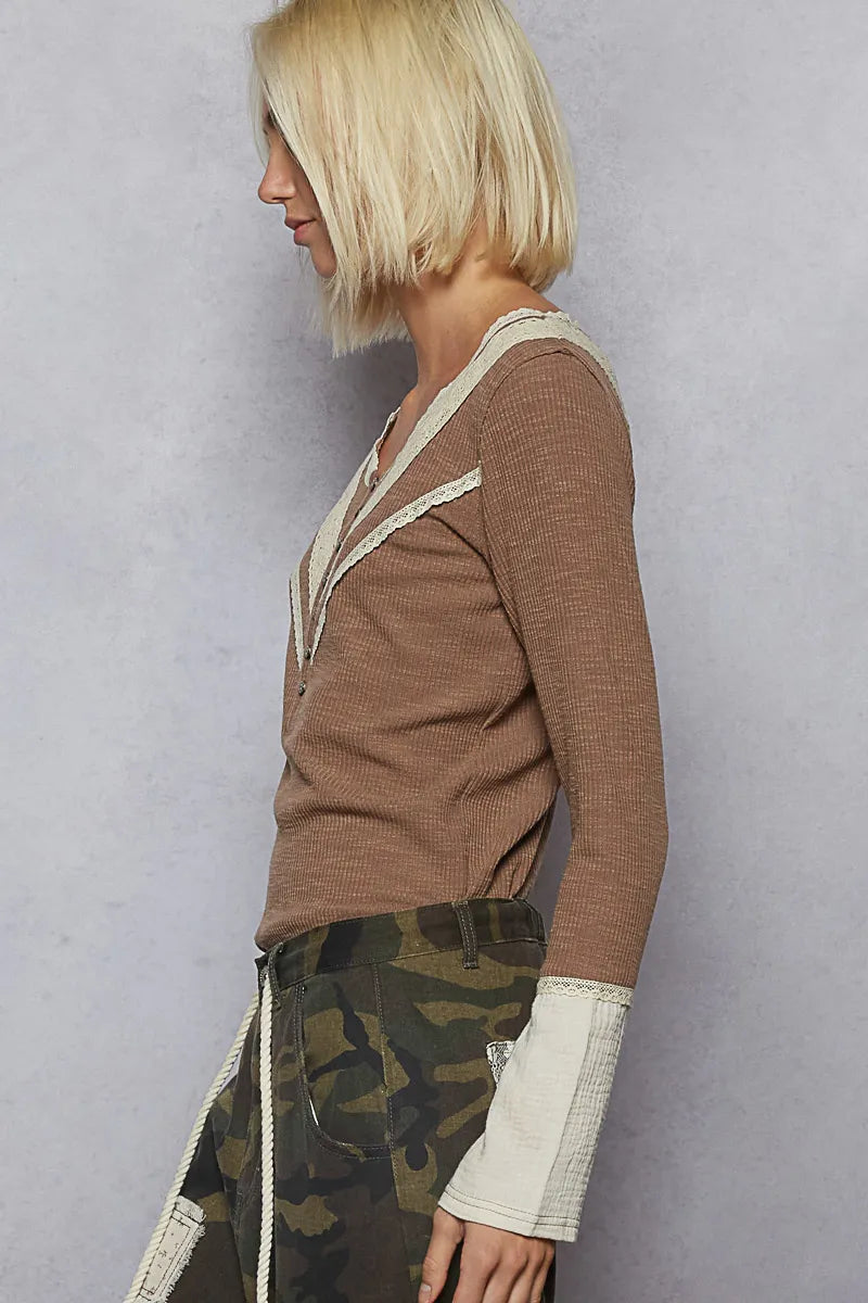 Stay stylish with this Ribbed Half Button Lace Detail Knit Top. The ribbed knit fabric provides a flattering fit while the half button design adds a touch of sophistication. The delicate lace detailing enhances the feminine look of this top, making it perfect for both casual and dressy occasions. Update your wardrobe with this chic and versatile piece today!