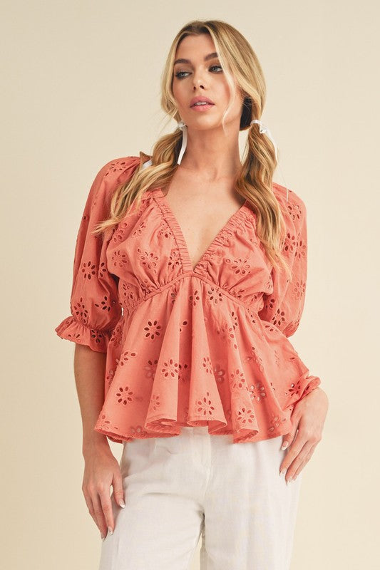 Aemi + Co Eyelet Embroidered V-Neck Half Sleeve Peplum Blouse