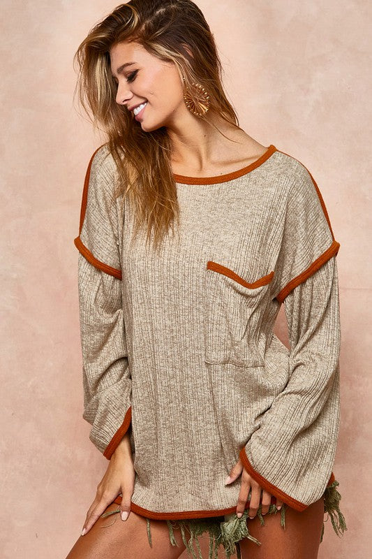 BiBi Contrast Trim Round Neck Brushed Uneven Rib Top