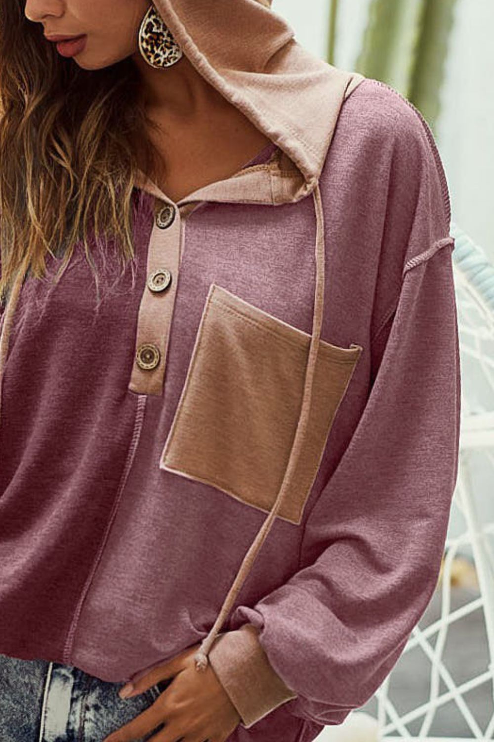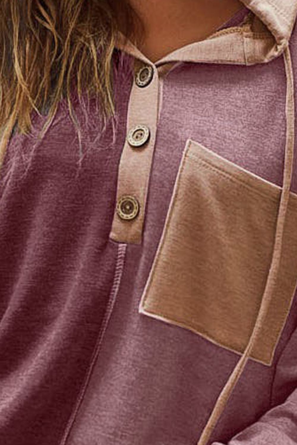 BiBi French Terry Color Block Button Detail Drawstring Hoodie