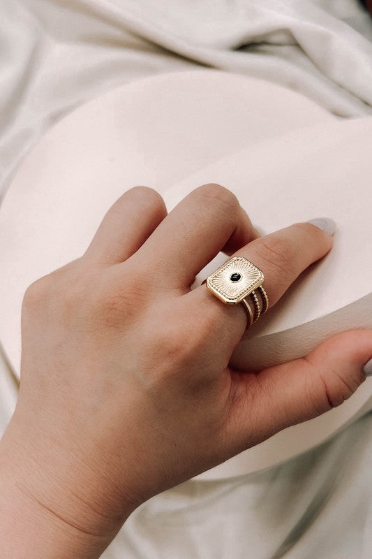 A rectangle charm with a black oval in the center on a triple-layered gold band.