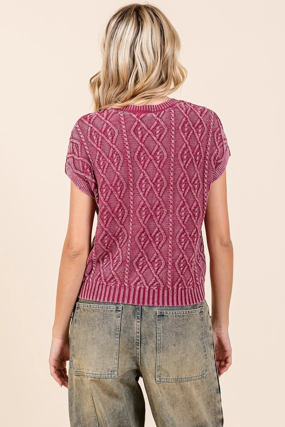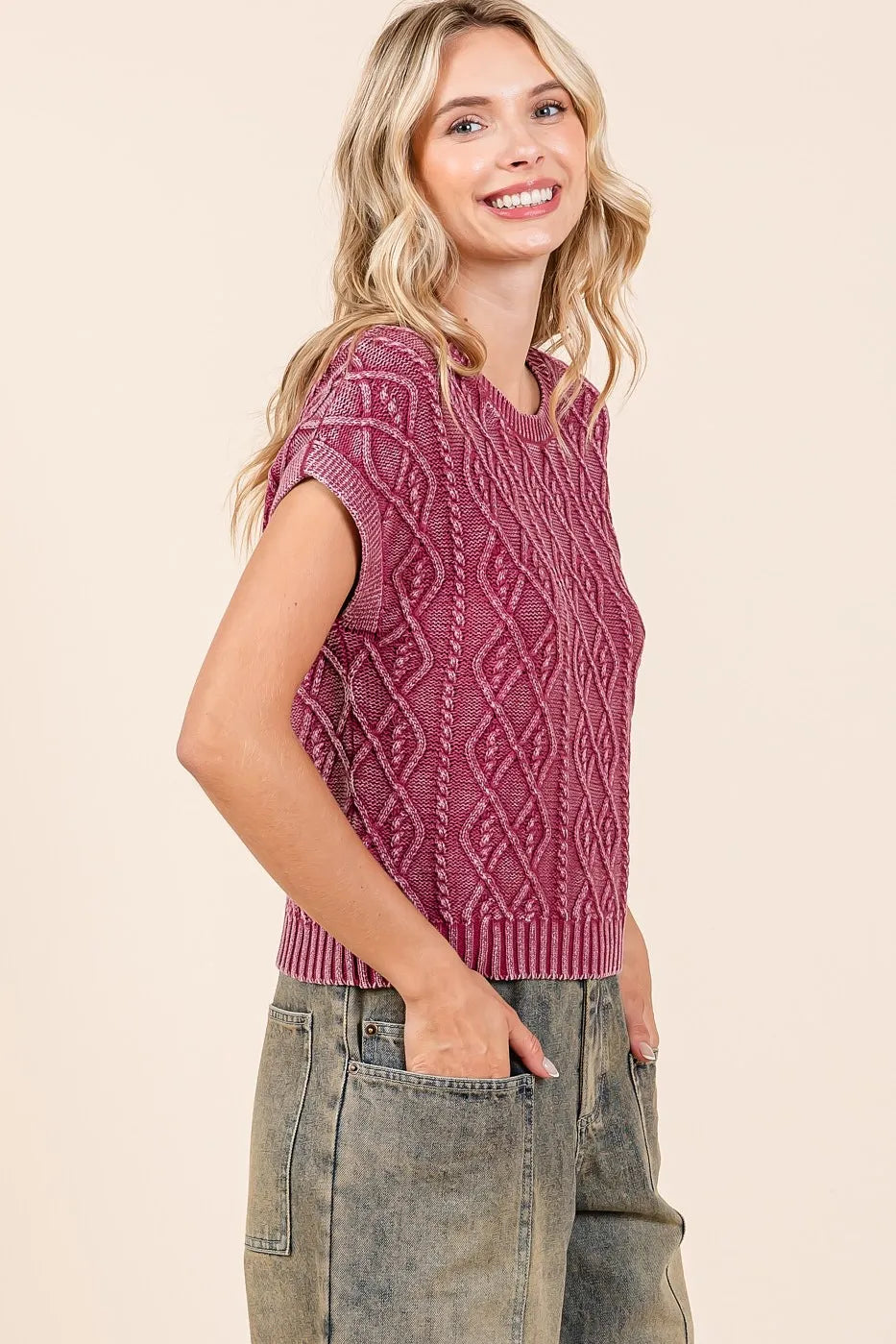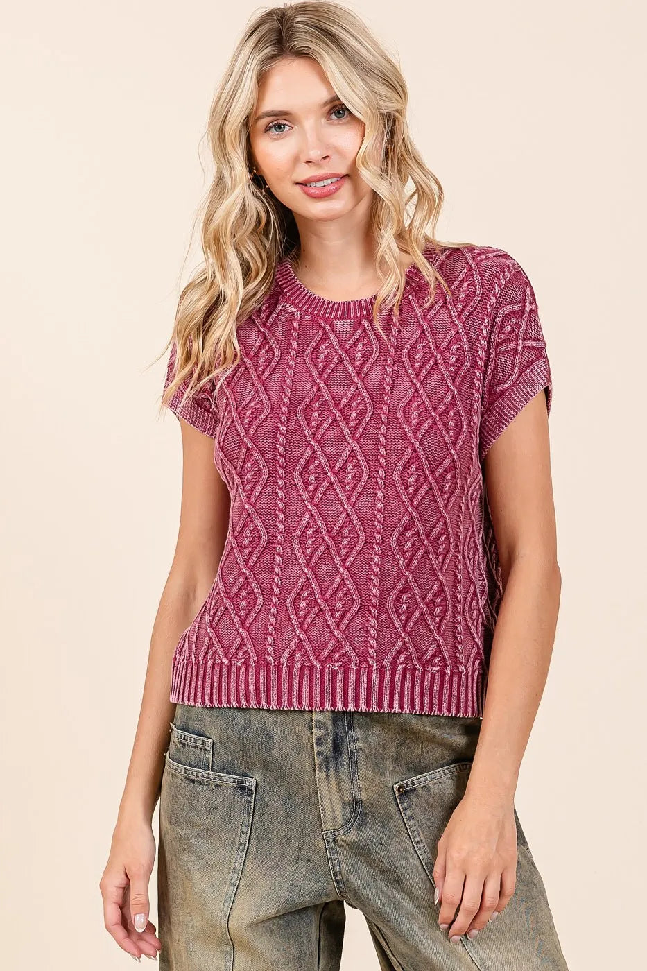 This cap sleeve sweater top is crafted from a mineral wash cable knit fabric, combining a trendy look with a cozy feel. The cap sleeves add a unique touch to the classic cable knit design. Perfect for layering or wearing on its own for a stylish outfit. Elevate your wardrobe with this chic and comfortable mineral wash sweater top!