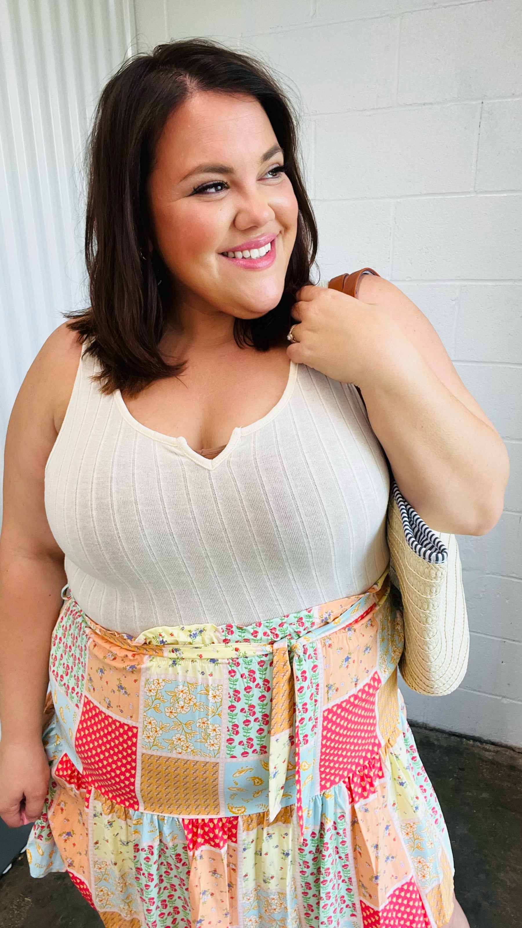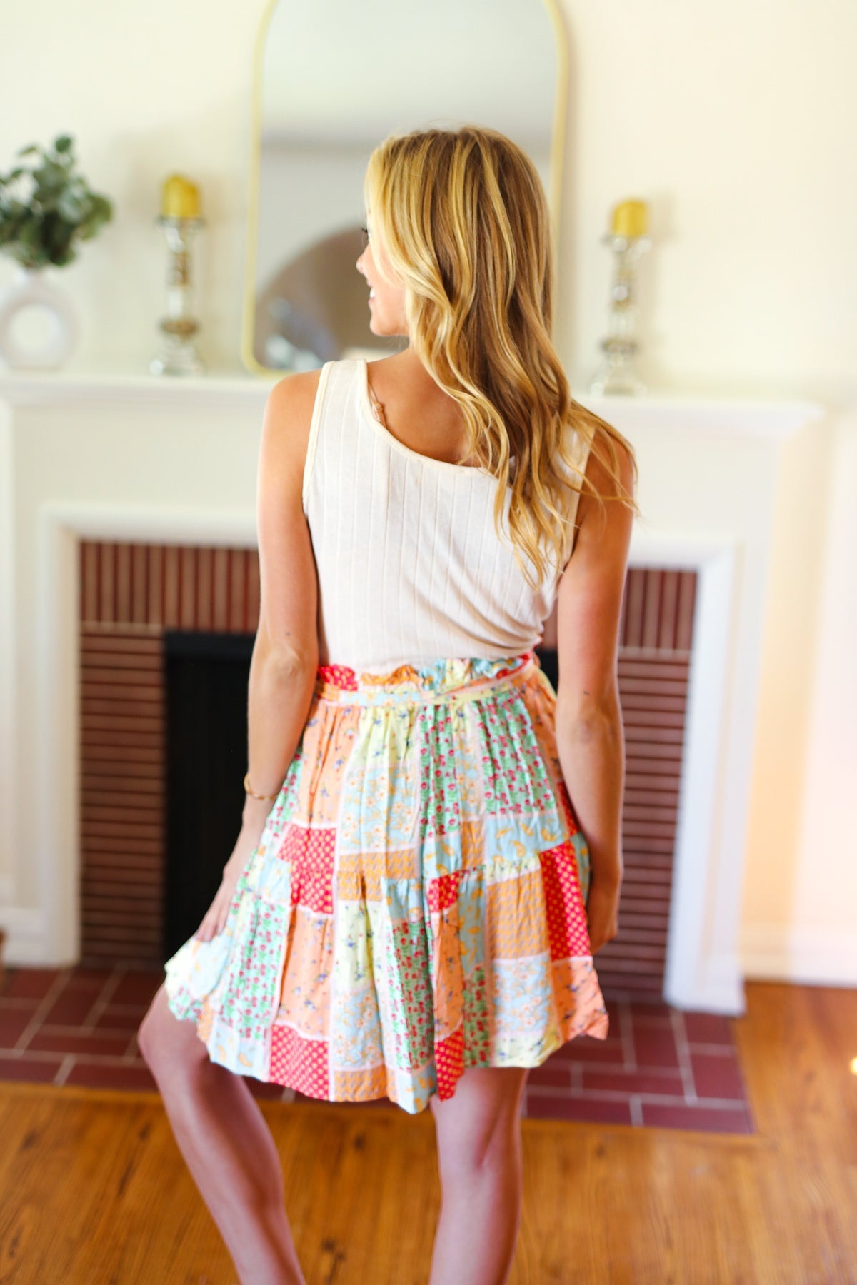Multicolor Patchwork Two-Fer Rib Elastic Waist Belted Dress