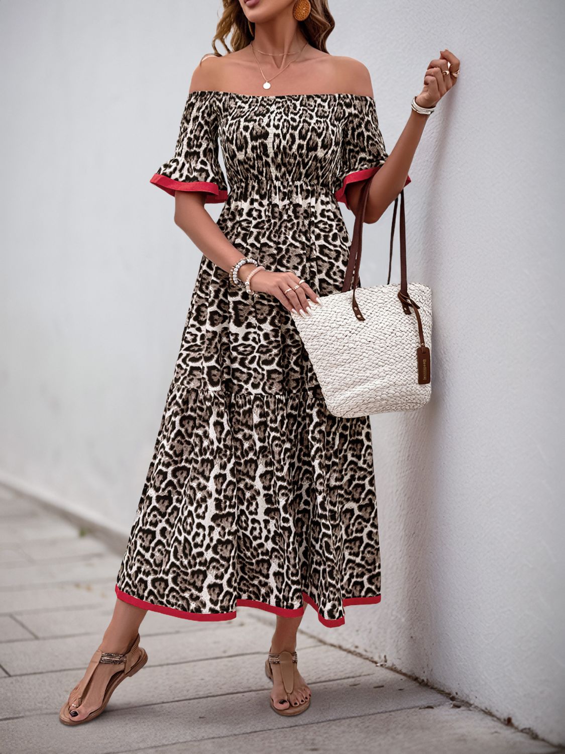 Perfee Leopard Off-Shoulder Flounce Sleeve Midi Dress
