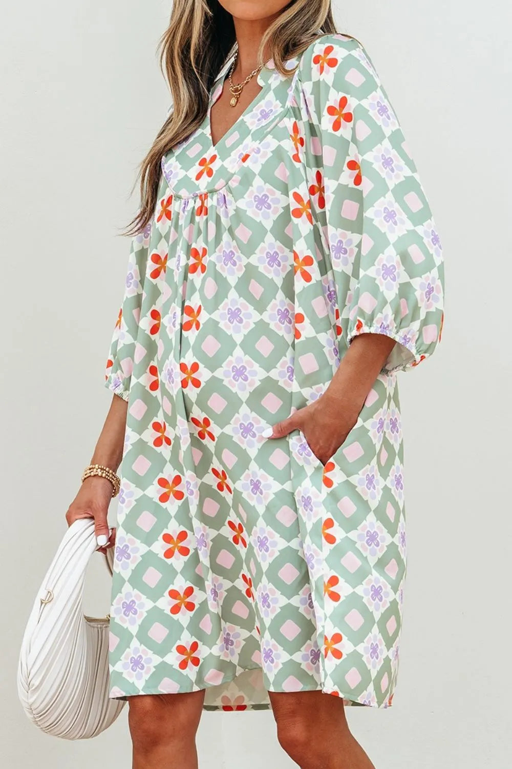Printed Notched 3/4 Balloon Sleeves Loose Dress
