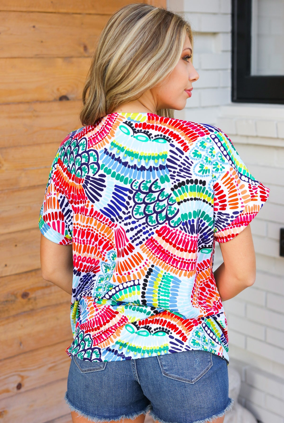 This stunning teal and orange tropical abstract print top designed with banded short sleeves and a casual V neck adds charm to any outfit.