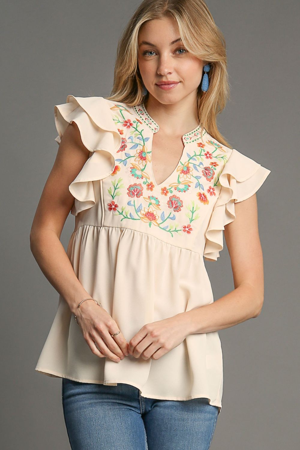 Umgee Full Size Embroidery Notched Double Ruffle Sleeve Blouse Plus Size