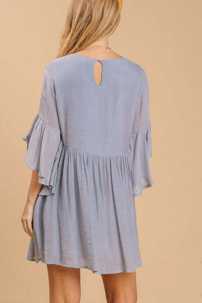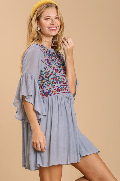 Umgee Full Size Floral Embroidered 3/4 Bell Sleeve Keyhole Dress Plus Size