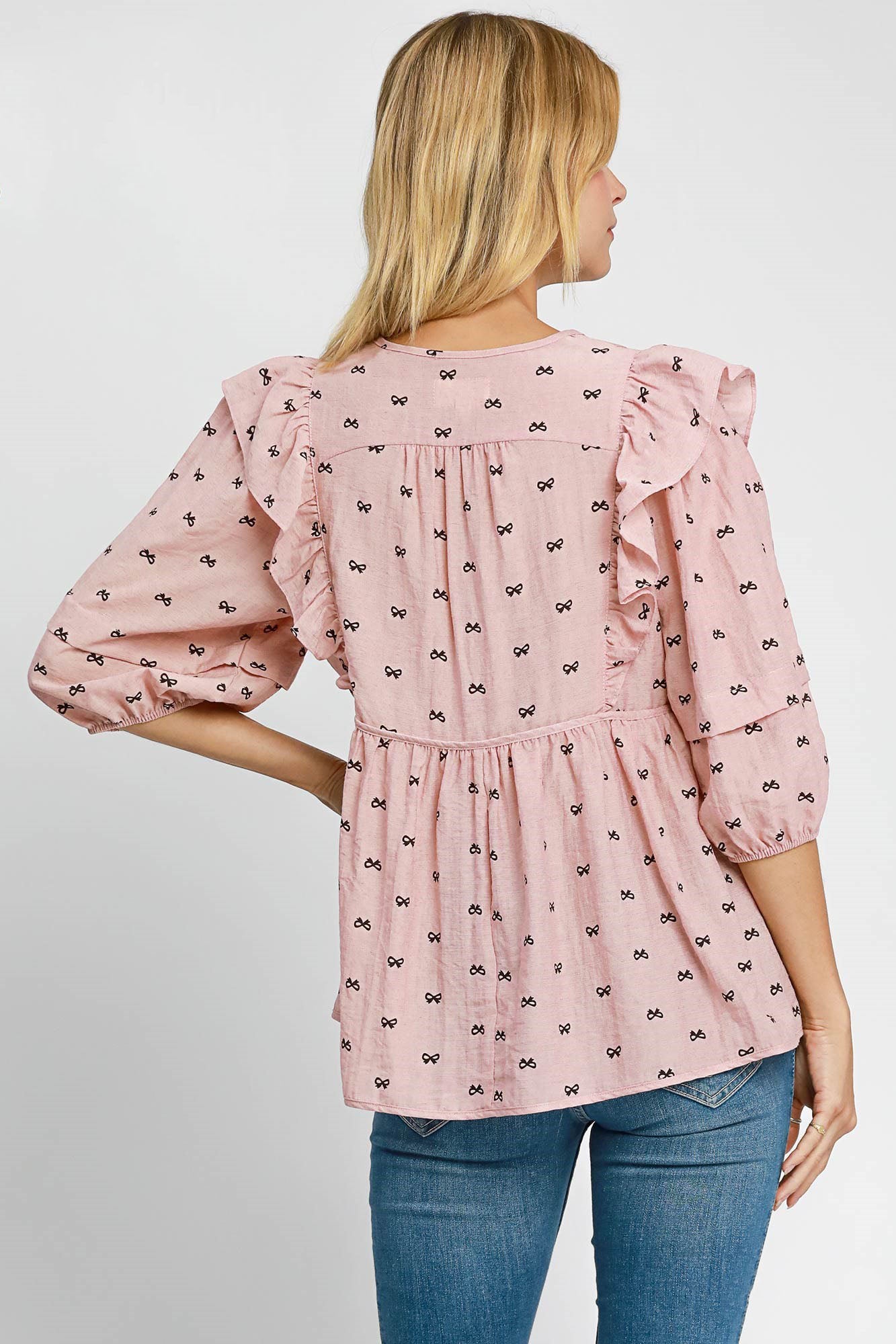 Umgee Full Size Ruffled Bow Print Tie Neck Peplum Blouse Plus Size