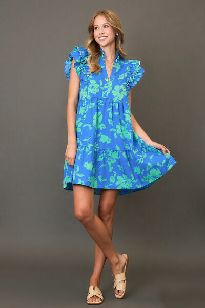 Umgee Full Size Two Tone Floral Print Ruffle Cap Sleeve Mini Dress Plus Size