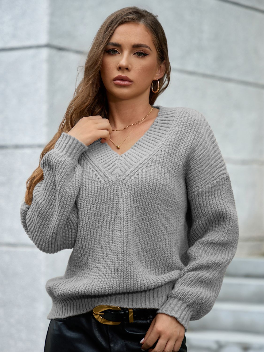 V-Neck Dropped Shoulder Long Sleeve Sweater