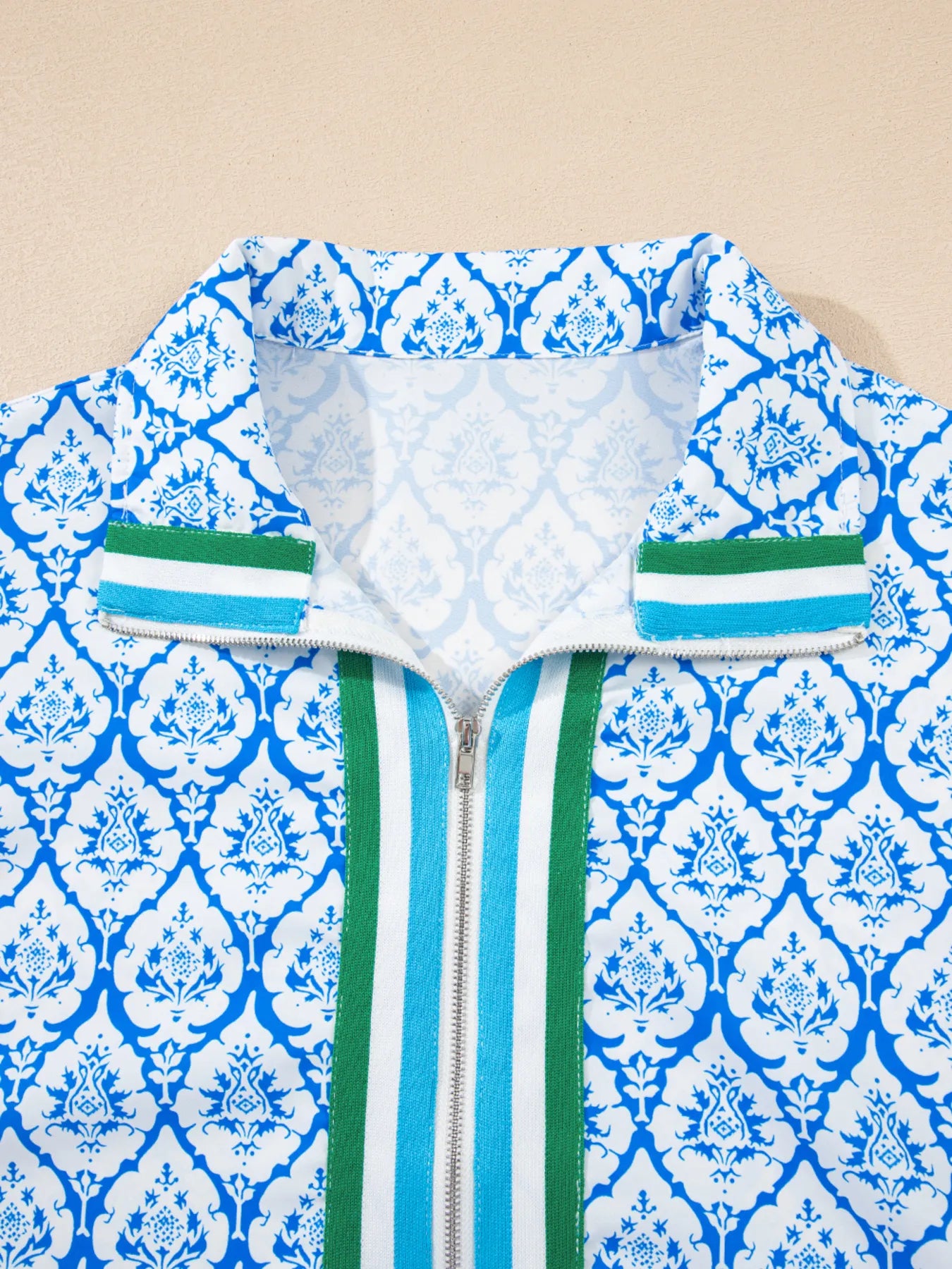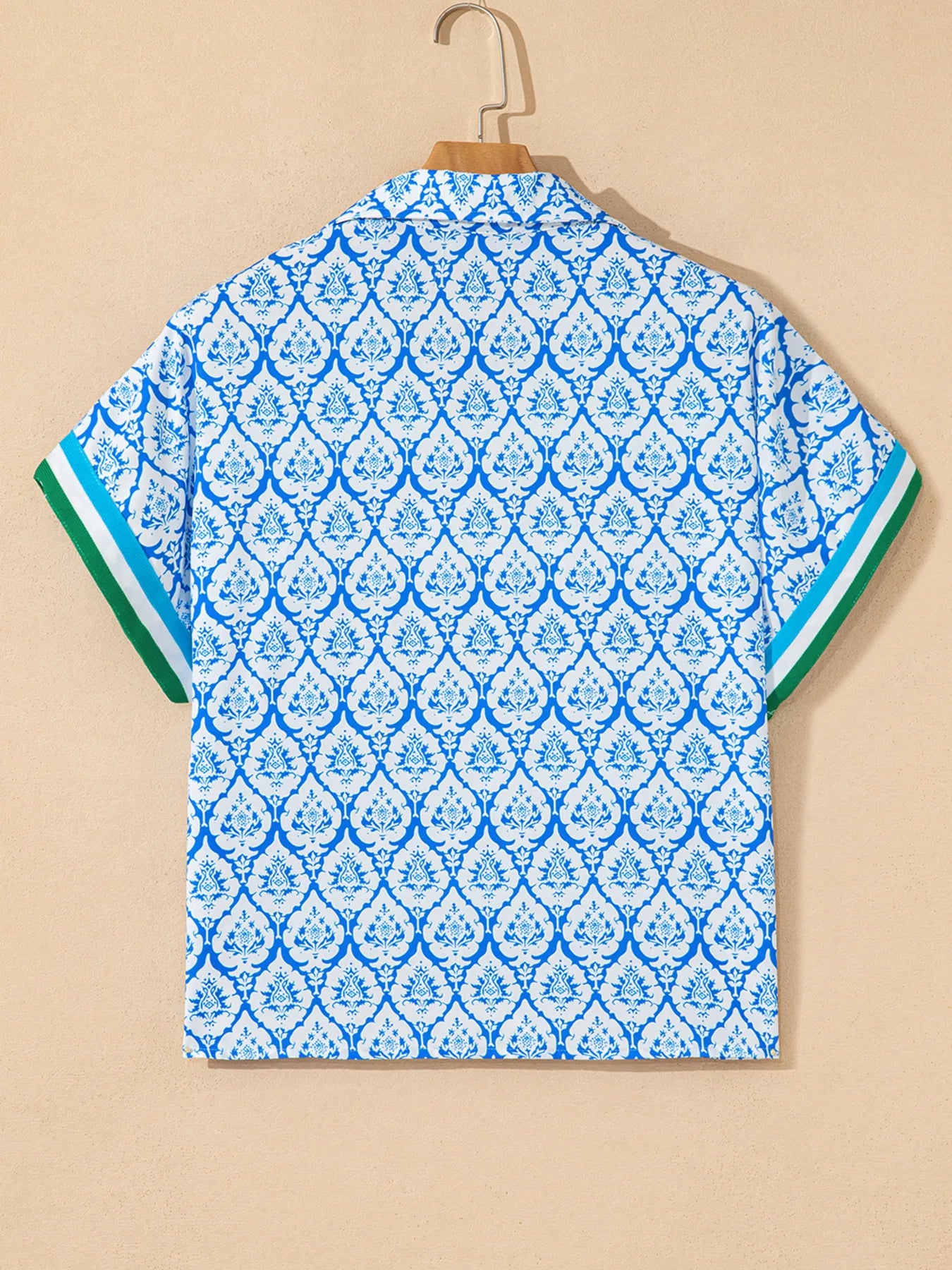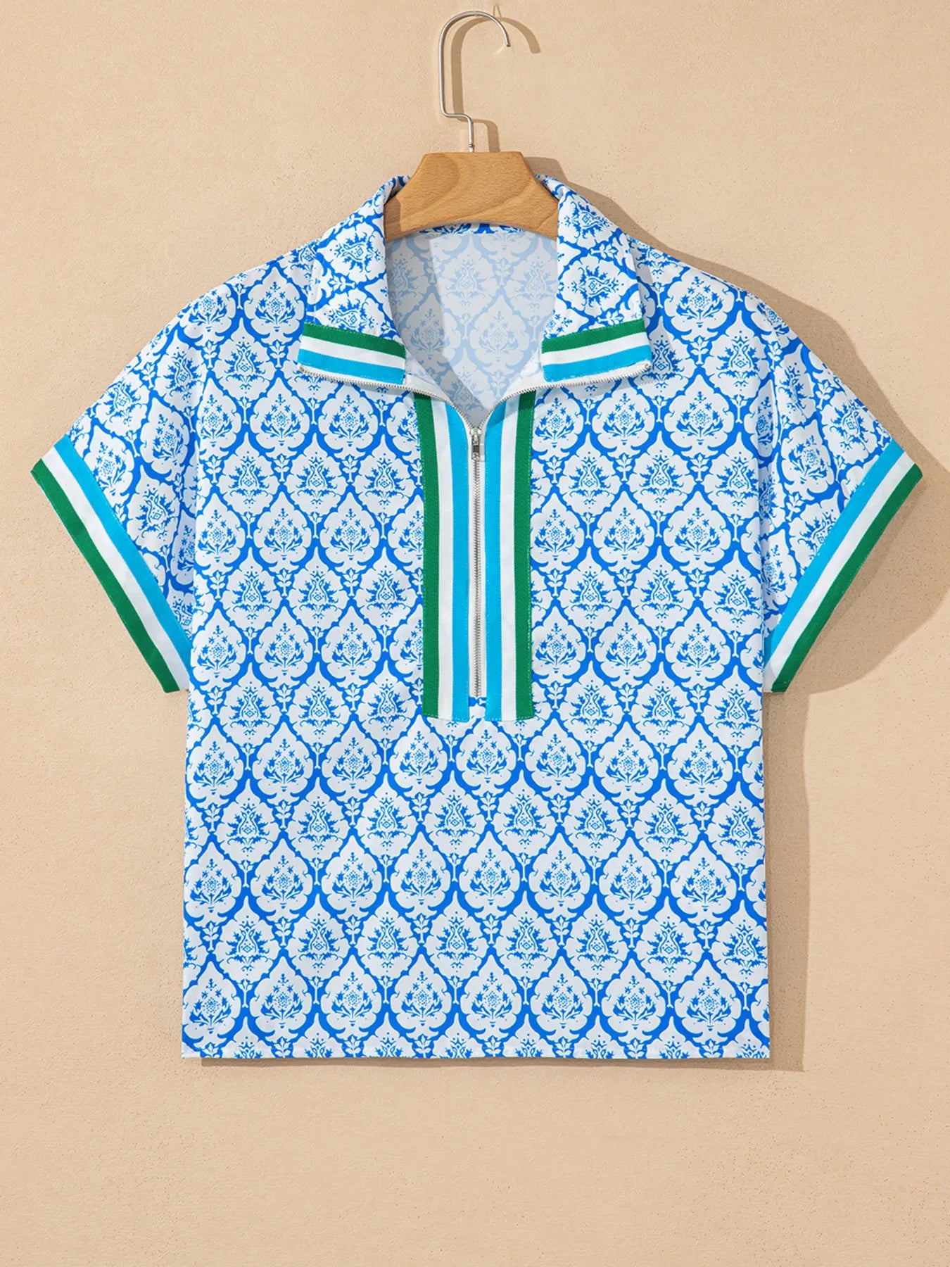 Western Print Zipped Collar Short Sleeve Summer Blouse Top