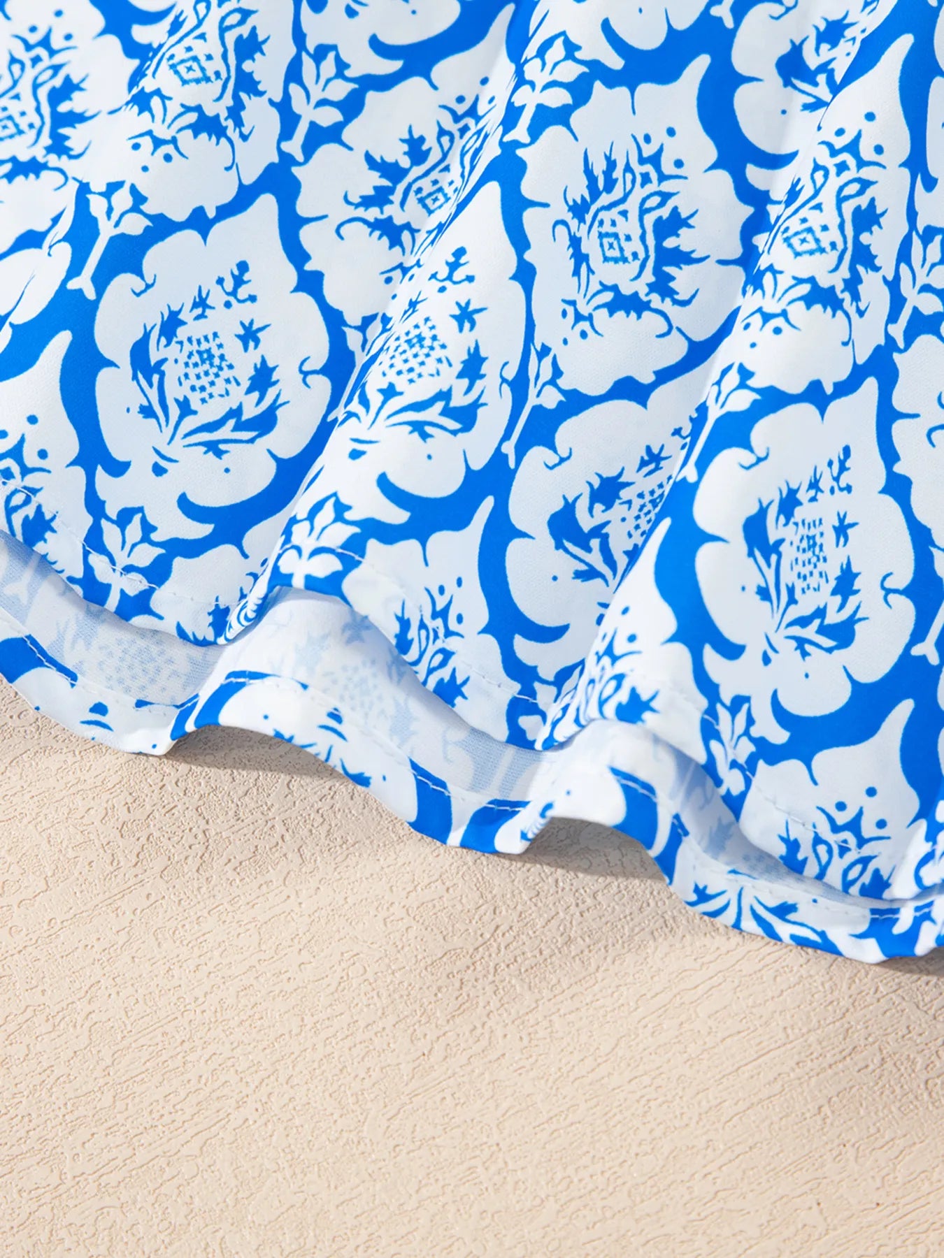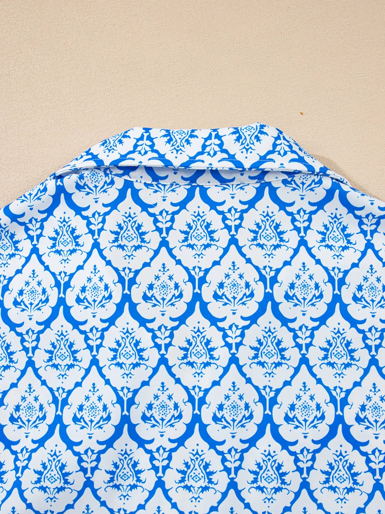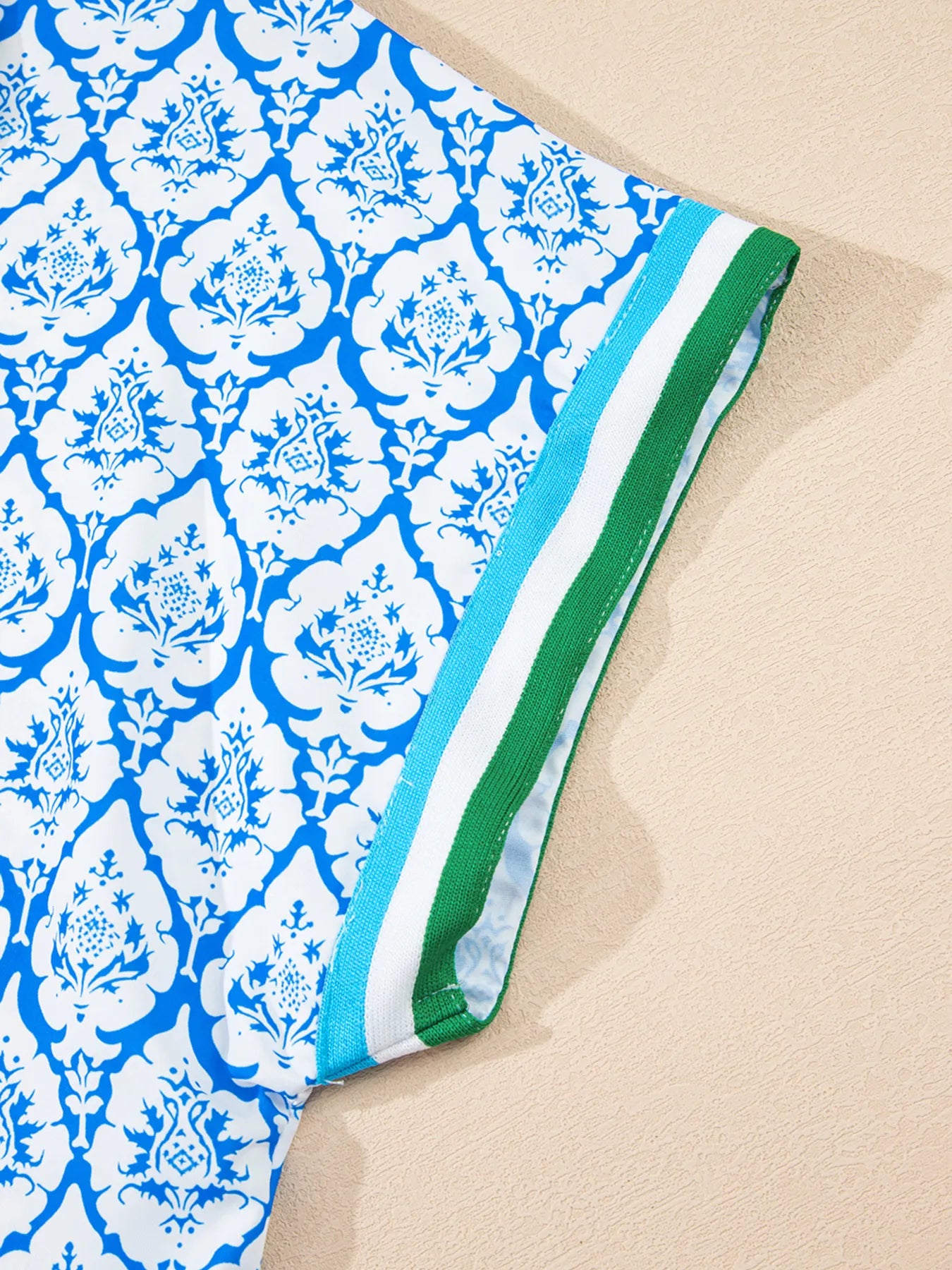 Western Print Zipped Collar Short Sleeve Summer Blouse Top